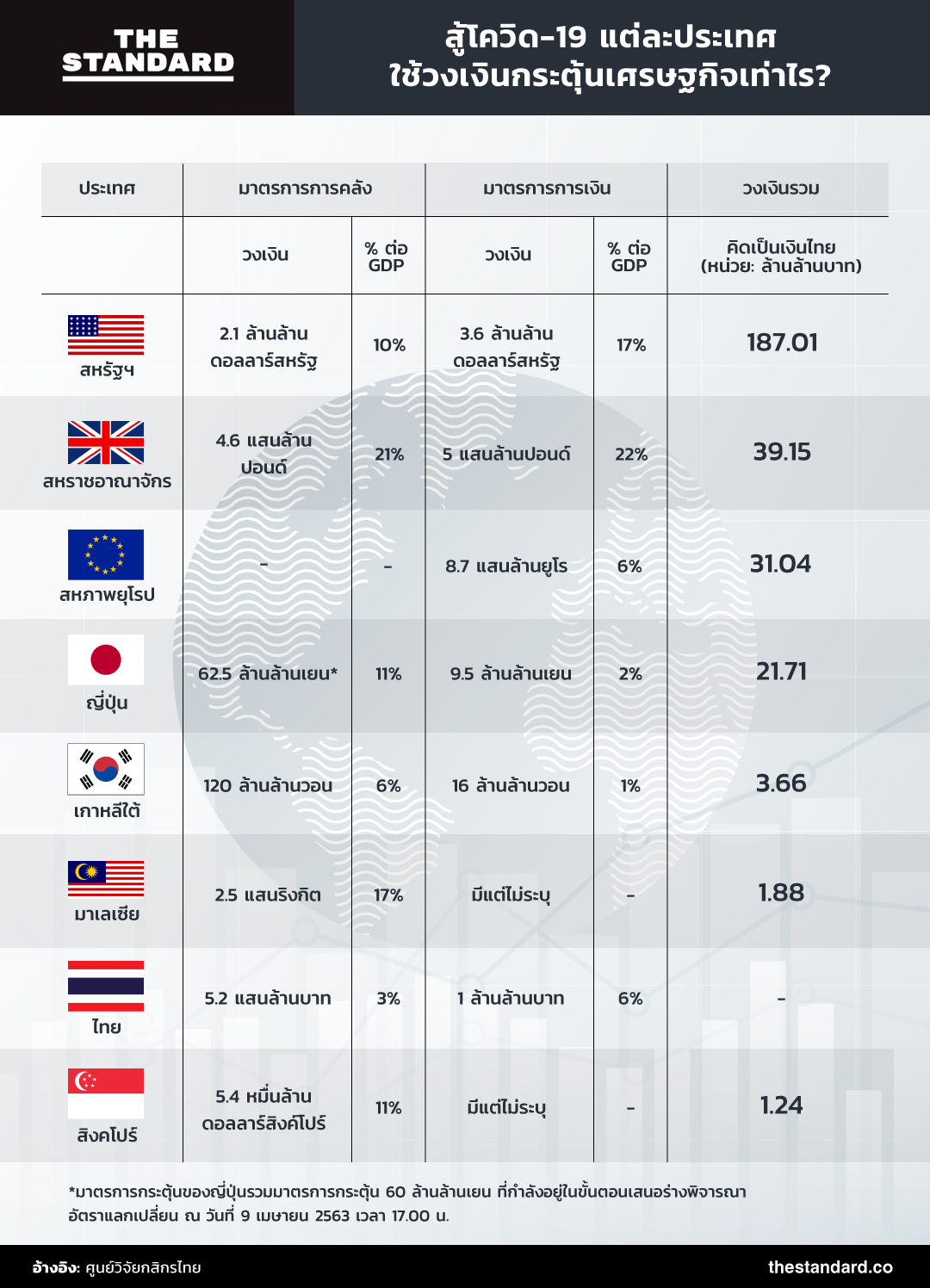 วิกฤตโควิด-19 เป็นปัญหาใหญ่ที่ทั่วโลกต้องจับตามอง ขณะนี้เลยเห็นหลายประเทศอัดมาตรการกระตุ้นเศรษฐกิจเพื่อสู้กับโควิด-19 หลายประเทศใช้เงินสูงกว่า 10% ของ GDP ว่าแต่ในต่างประเทศตั้งวงเงินมาตรการเหล่านี้เท่าไรกันบ้าง?