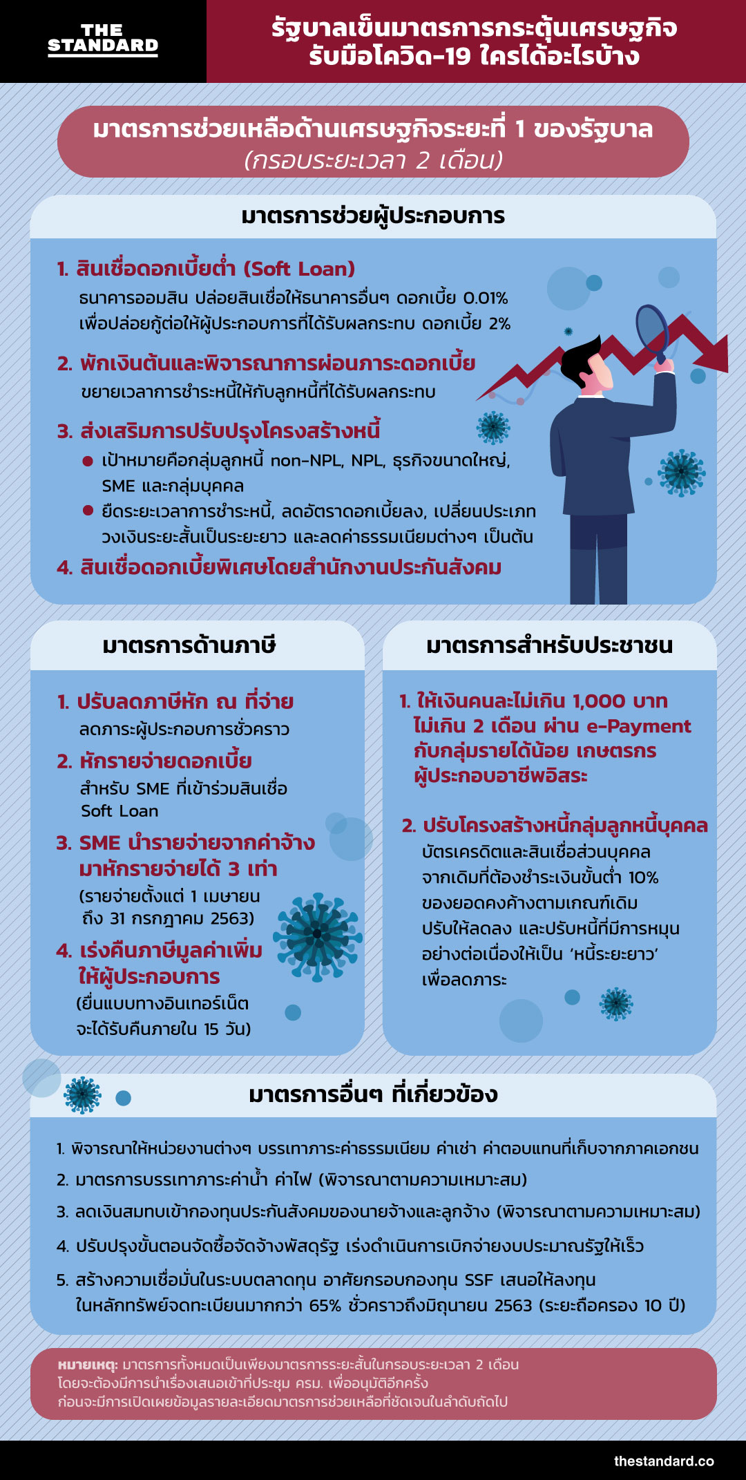 หลังการประชุมคณะรัฐมนตรีเศรษฐกิจเช้าวันนี้ (6 มีนาคม) ได้มีการเปิดเผยมาตรการช่วยเหลือด้านเศรษฐกิจสำหรับผู้ประกอบการและประชาชนที่ได้รับผลกระทบจากโควิด-19 ทั้งทางตรงและทางอ้อมในระยะแรก (ระยะสั้น) ในกรอบระยะเวลา 2 เดือน โดยมีรายละเอียดดังนี้