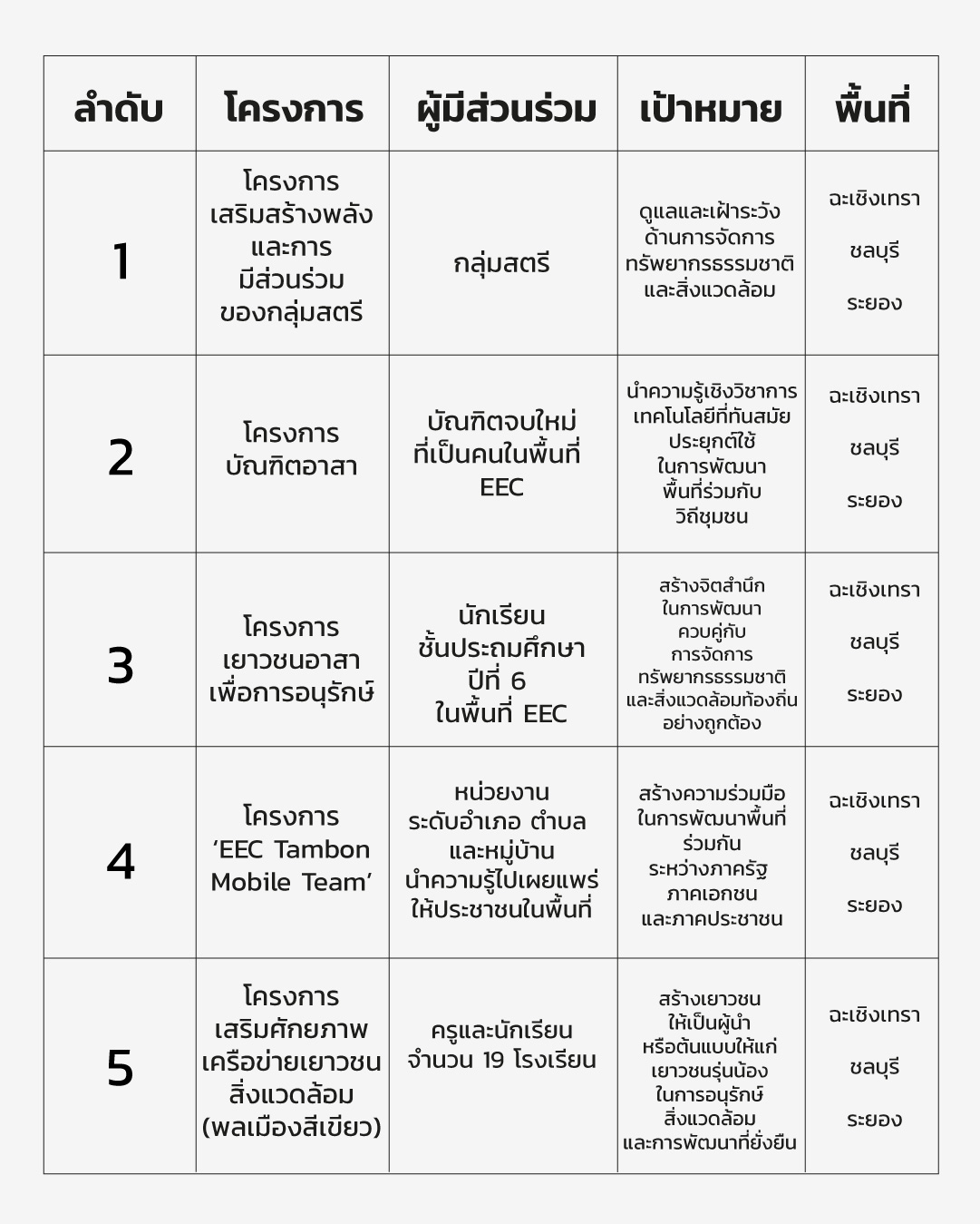 ในปี 2563 สำนักงานคณะกรรมการนโยบายเขตพัฒนาพิเศษภาคตะวันออก (สกพอ.) ได้ดำเนินงานเพื่อส่งเสริมให้เกิดการมีส่วนร่วมของชุมชนและประชาชนในพื้นที่ 3 จังหวัดของ EEC ได้แก่ จังหวัดฉะเชิงเทรา, ชลบุรี และระยอง เพื่อผนึกกำลัง องค์ความรู้ ภูมิปัญญาจากพี่น้องประชาชนในพื้นที่ มาร่วมเป็นส่วนหนึ่งในการวางแผนพัฒนาด้านสังคมและสิ่งแวดล้อมในอนาคต ผ่านโครงการสำคัญๆ ได้แก่