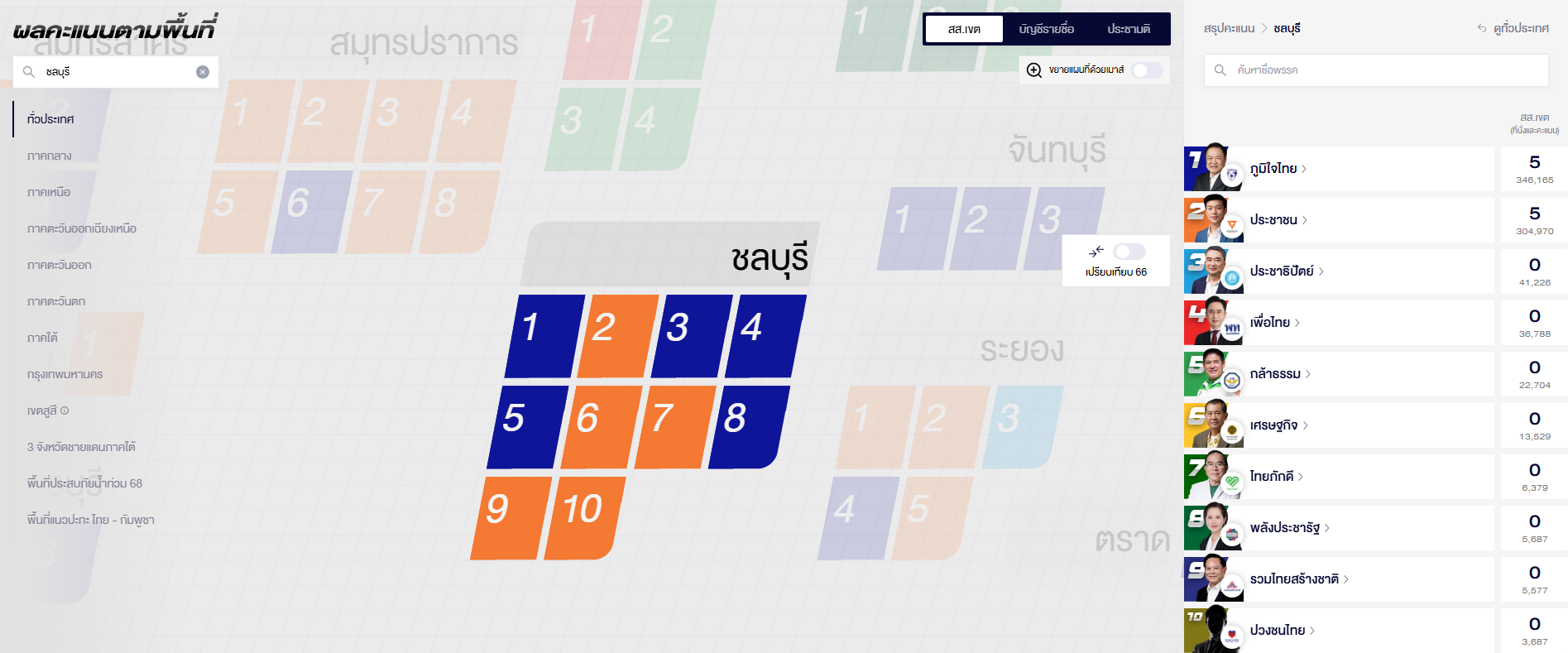 อัปเดต ผลคะแนนเลือกตั้ง สส. ชลบุรี 10 เขต (อย่างไม่เป็นทางการ)