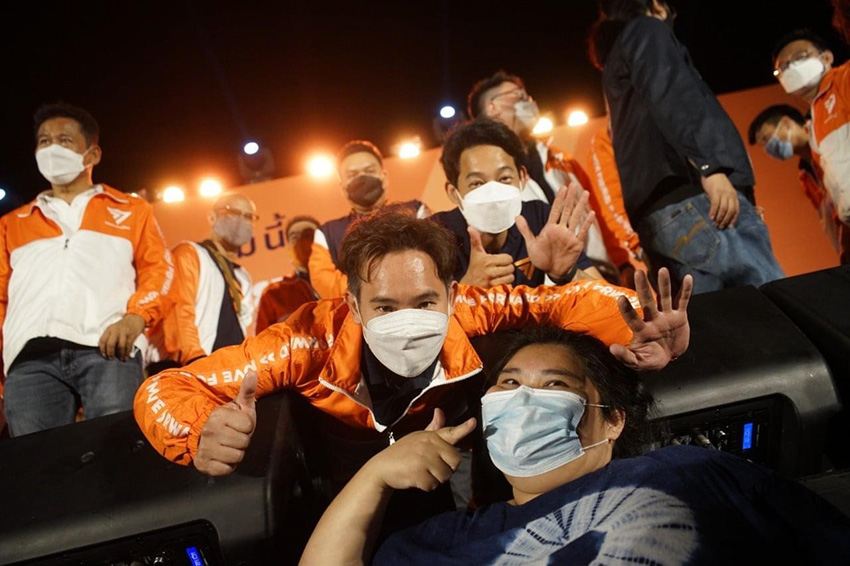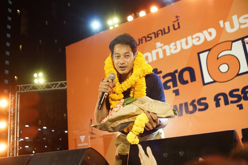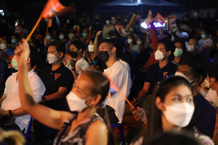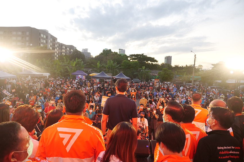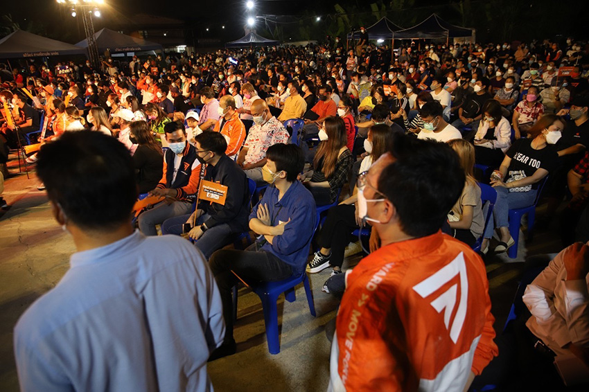 กรุณพล เทียนสุวรรณ ผู้สมัคร ส.ส. พรรคก้าวไกล เบอร์ 6 กล่าวในการปราศรัยตอนหนึ่งว่า การเกิดขึ้นของพรรคอนาคตใหม่ ซึ่งเป็นพรรคการเมืองของประชาชน ไม่มีนายทุนคนใดผูกขาด เป็นที่รวมของคนหลากหลายสาขาอาชีพ และด้วยผลงานการแก้ปัญหาตามระบอบรัฐสภา ก็เหมือนเป็นแสงสว่างปลายอุโมงค์ให้กับตนเองและประชาชนทุกคน แต่วันหนึ่งแม้พรรคถูกยุบ แต่เมล็ดพันธุ์ที่หว่านลงไปได้งอกมาเป็นพรรคก้าวไกล ซึ่งเมื่อตนทราบข่าวนี้ สิ่งหนึ่งที่ทำได้คือเดินไปสมัครที่พรรค เพราะมันเป็นความอัดอั้นใจ ซึ่งเชื่อว่าหลายคนก็อึดอัดใจกับสิ่งที่เป็นอยู่ในประเทศนี้ เราเห็นคนลำบากมามากไปแล้ว เราเห็นอนาคตของชาติถูกขังอยู่ในเรือนจำเพียงเพราะออกมาเรียกร้องอนาคตของเขา เพียงเพราะเขาออกมาเรียกร้องเสรีภาพในการพูด วันนี้ประชาชนที่เจอได้บอกให้ช่วยส่งเสียงหน่อยว่า ก่อนนี้เขาเคยมีบ้าน มีรถ มีเงินเก็บ วันนี้ขายรถไปแล้ว เงินเก็บไม่มีสักบาท มองไม่เห็นอนาคต ไม่รู้ลูกจะอยู่อย่างไร ซึ่งวันนี้ ตนเป็นคนตัวเล็กๆ แต่ก็อยากจะมีสิทธิ์ที่ทำให้พี่น้องประชาชนมีชีวิตความเป็นอยู่ที่ดีกว่านี้ หลายคนที่อยู่ตรงนี้เคยคิดว่าเราจะอยู่กันไปอย่างไร ทุกวันนี้เราลำบากมาก แล้วยิ่งลูกหลานของเรา วันข้างหน้าเขาจะอยู่อย่างไร มีเด็กคนหนึ่งมาบอกให้สู้ๆ สู้ให้ชนะ หนูยากกลับไปเรียน ถามว่าเพียงพอหรือยังกับการที่ลูกหลานเราต้องอยู่บ้าน ไม่ได้ไปโรงเรียน ไม่มีเพื่อน เพียงพอหรือยังกับการบริหารที่ผิดพลาด ไม่มีวัคซีนเพียงพอ ประชาชนไม่ได้ใช้ชีวิตปกติ เศรษฐกิจไม่เปิด สิ่งที่รัฐบาลบอกเราคือว่าเราเป็นประเทศยากจน ไม่มีเงินแก้ปัญหาให้ประชาชน ไม่ว่าจะวิกฤตโรคระบาด วิกฤตเศรษฐกิจ แต่เรากลับได้เห็นว่ากระทรวงกลาโหมและคณะรัฐมนตรี ที่นำโดย พล.อ. ประยุทธ์ จันทร์โอชา อนุมัติงบซื้อเครื่องบินรบ เขาให้เราไม่ได้ แต่เขาเอาไปใช้กับการซื้ออาวุธได้