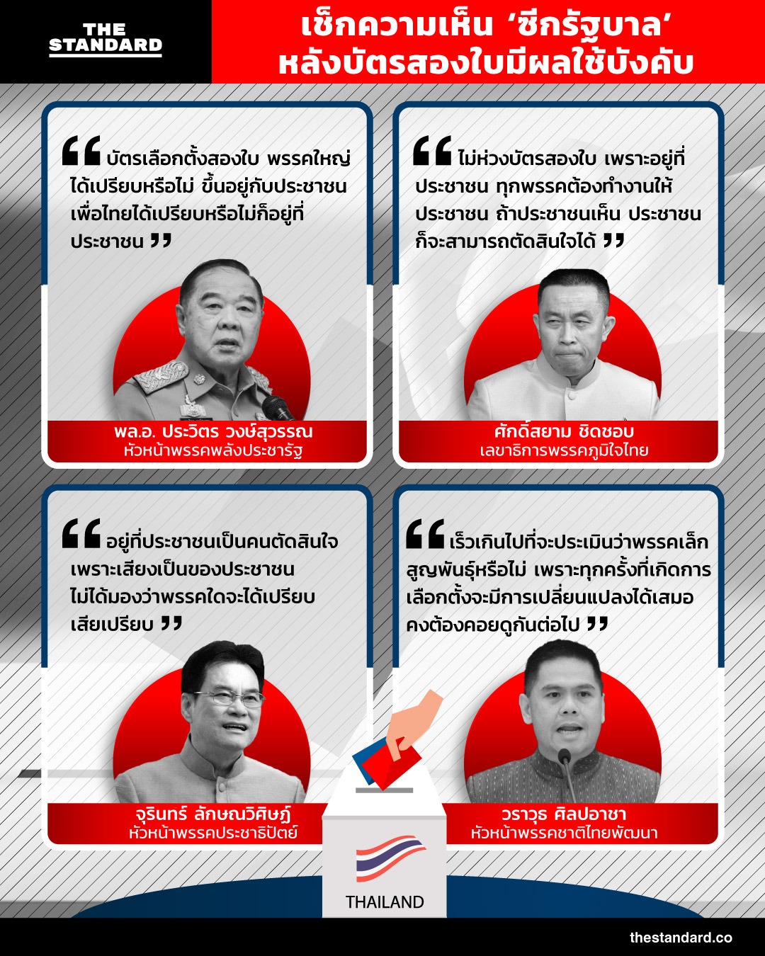 ขณะที่วันนี้ (23 พฤศจิกายน) แกนนำพรรคฝ่ายรัฐบาลได้ให้สัมภาษณ์ถึงประเด็น ‘บัตรสองใบ’ ซึ่งมีรายละเอียดที่น่าสนใจ ดังนี้