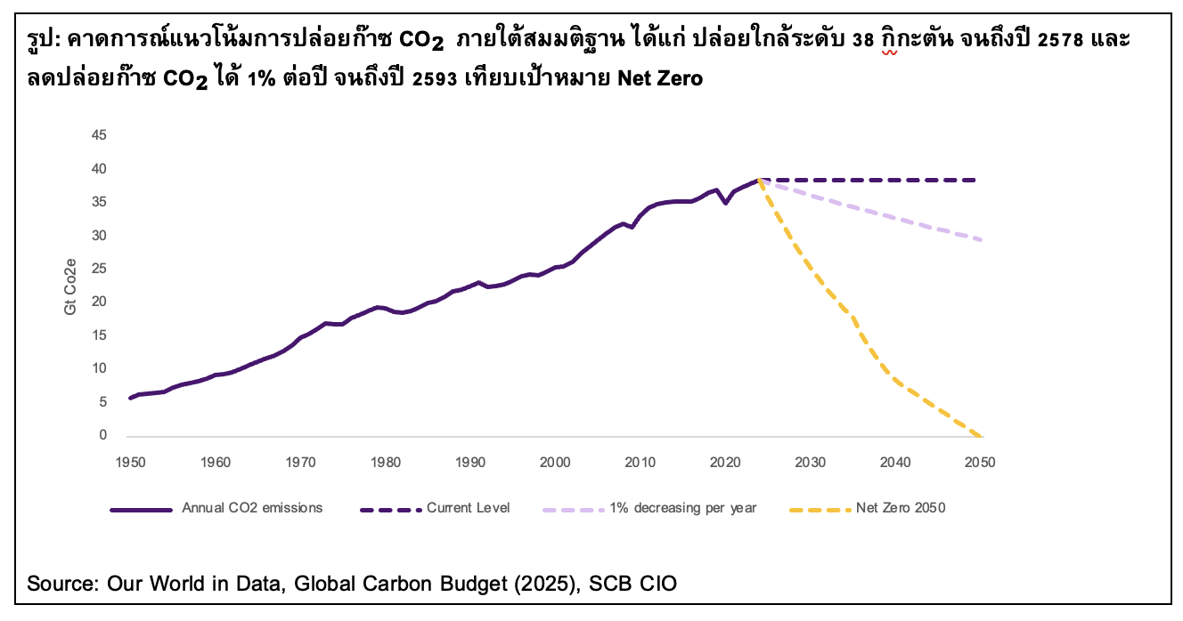 ¬รูป: คาดการณ์แนวโน้มการปล่อยก๊าซ CO₂ ภายใต้สมมติฐาน ได้แก่ ปล่อยใกล้ระดับ 38 กิกะตัน จนถึงปี 2578 และลดปล่อยก๊าซ CO₂ ได้ 1% ต่อปี จนถึงปี 2593 เทียบเป้าหมาย Net Zero