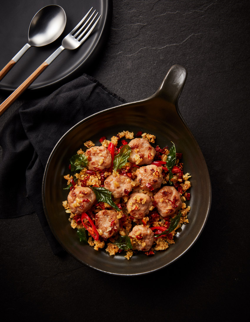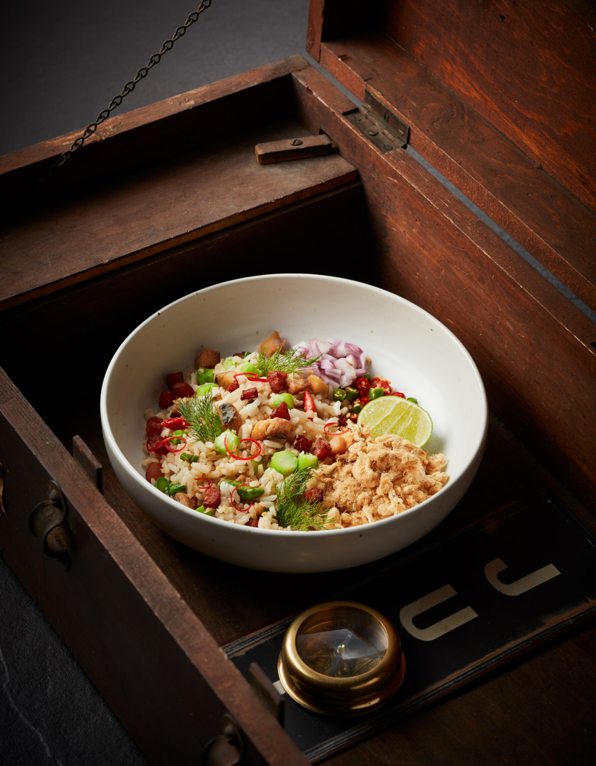 และถ้าต้องเลือกเมนูข้าวสักจานในลิสต์เมนูใหม่ ข้าวผัดปลาเค็มทรงเครื่องคะน้าฮ่องกง น่าจะถูกขานชื่อบ่อยกว่าใครเพื่อน ถึงในเมนูจะไม่ได้บอกว่าจานนี้ได้สูตรต้นตำรับมาจาก เชฟกิ๊ก กมล ร้านเลิศทิพย์ แต่ความทรงจำเรื่องรสชาติแบบไทยที่อาหารหนึ่งจานควรจะครบรส ข้าวผัดกับปลาเค็ม จึงดูเป็นมวยถูกคู่ ยิ่งได้วิธีการผัดข้าวจากสุดยอดเชฟ และเทคนิคซุกซ่อนปลาเค็มให้ติดรสชาติทุกคำที่ตัก นี่คืออีกหนึ่งเมนูไทยๆ ที่ไม่ธรรมดา