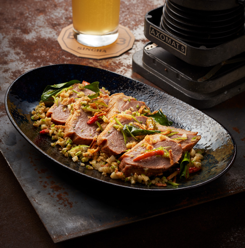 ไต่ระดับความเผ็ดร้อนขึ้นมาอีกหน่อยกับ อกเป็ดผัดเผ็ดซ่า ความซ่าที่ได้มาจากพริกลูกโดดเป็นตัวการ ถ้าจะให้กลมกล่อมจบในคำเดียว ต้องเคี้ยวอกเป็ดนุ่มๆ กับเครื่องสมุนไพรตำละเอียด กลิ่นมะกรูดและผิวมะกรูดหอมขึ้นจมูกนักแล