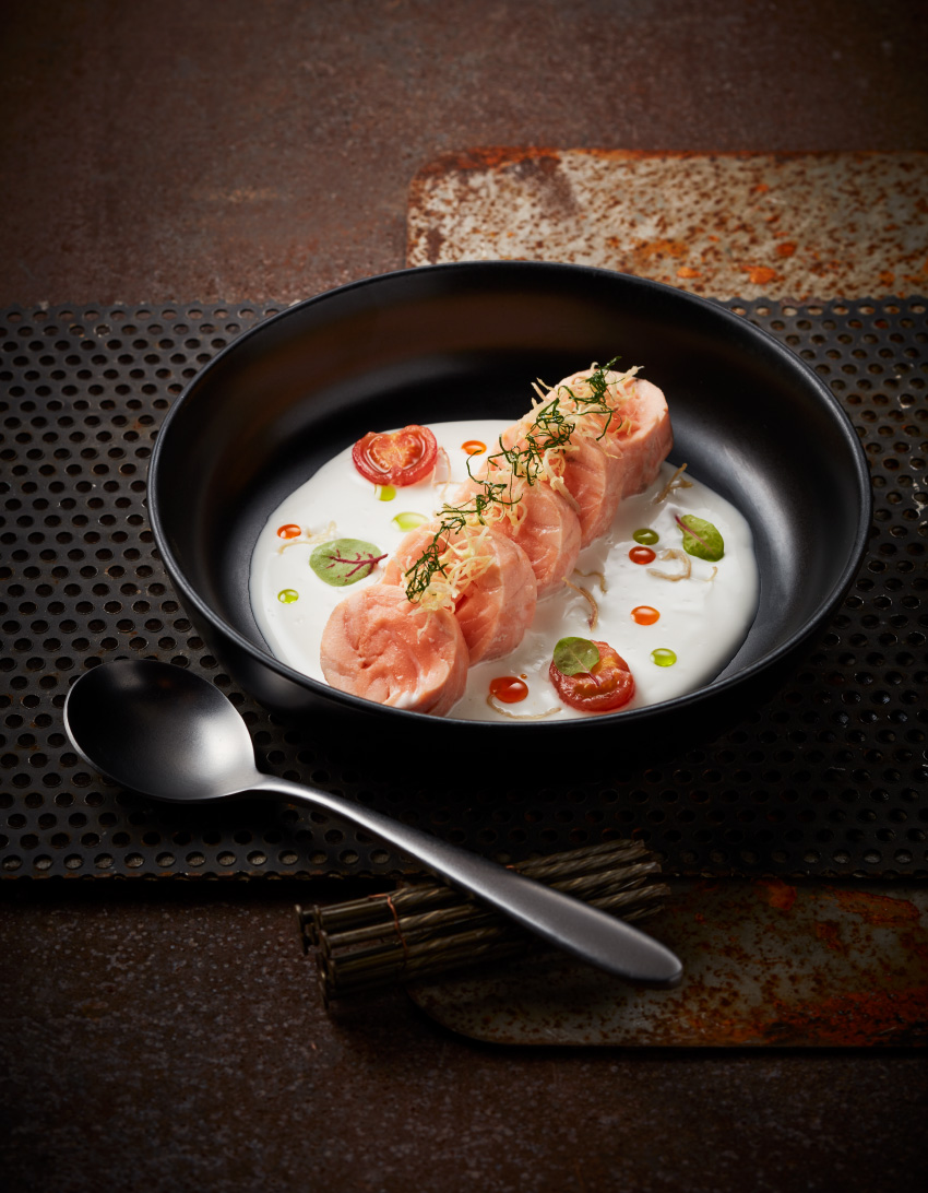 ปรับระดับความเผ็ดลงมาก่อนจะเข้าสู่ช่วงอิ่มจริงกับ แซลมอนต้มข่า ใครที่เลิฟความขาวข้นของต้มข่าไก่จะต้องติดใจ เพราะอัปความเข้มข้นของเครื่องต้มข่าให้กลายเป็นซอสข่าไก่ จับแต่งองค์ใหม่เปลี่ยนจากไก่เป็นแซลมอนม้วนชิ้นใหญ่กินได้เต็มคำ