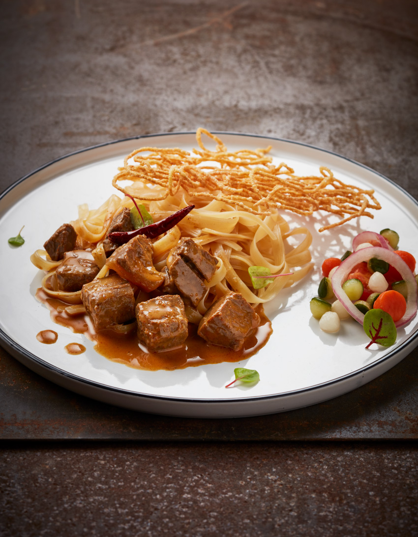ทวิสต์อารมณ์ไปชิมเมนูชาวเหนืออย่าง ข้าวซอยเนื้อพาสต้า ที่นำมาแต่งตัวใหม่จนแทบไม่เหลือเค้าเดิม แต่นั่นแค่มองภายนอก เมื่อได้ลองชิมจะรู้ว่าเนื้อแท้ของความเป็นข้าวซอยยังอยู่ครบ แค่นำมาเล่าในบริบทใหม่ ใช้เส้นเฟตตูชินีแทนเส้นข้าวซอย นำไปผัดในน้ำข้าวซอยจนรสชาติแทรกซึมเข้าเส้น ฟีเจอริงกับเนื้อน่องลายตุ๋นนาน 6 ชั่วโมง จานนี้ได้คะแนนเต็มจากสายเนื้อและสายอาหารเหนือ