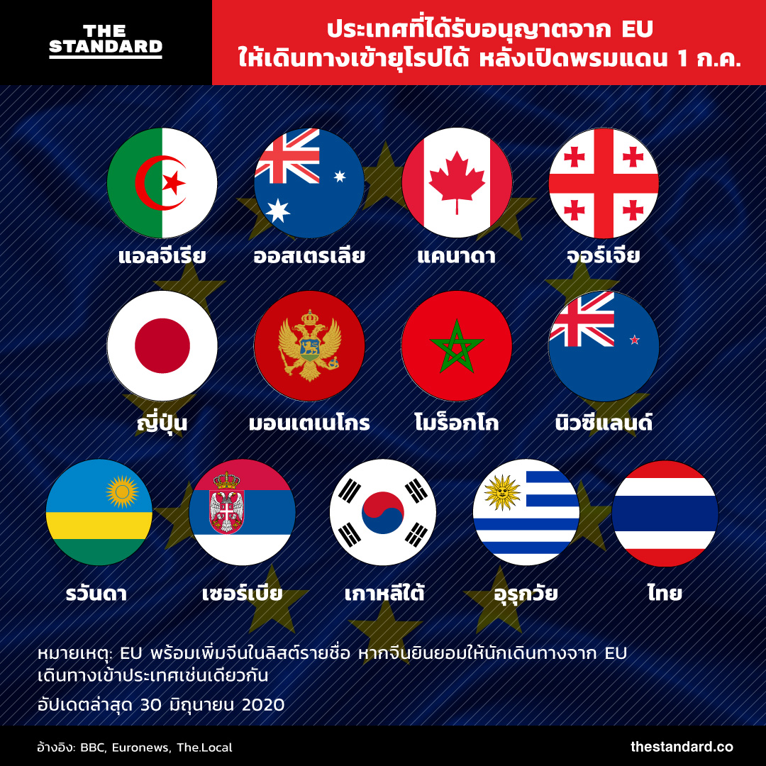 นี่คือลิสต์รายชื่อ 14 ประเทศเบื้องต้นที่ได้รับอนุญาตจากสหภาพยุโรป หรือ EU ให้นักเดินทางจากประเทศเหล่านี้สามารถเดินทางเข้ายุโรปได้ โดยเฉพาะประเทศที่เป็นสมาชิกของ EU เนื่องจากพิจารณาแล้วว่ามีความเสี่ยงต่ำ และสามารถควบคุมสถานการณ์การแพร่ระบาดของโควิด-19 ภายในประเทศได้ดี พร้อมเปิดพรมแดนต้อนรับตั้งแต่วันที่ 1 กรกฎาคมนี้