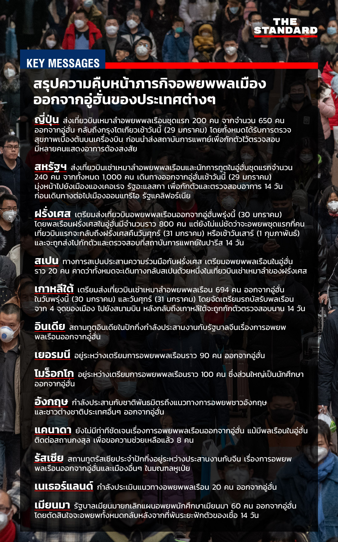ฝรั่งเศส: เตรียมส่งเที่ยวบินอพยพพลเรือนออกจากอู่ฮั่นพรุ่งนี้ (30 มกราคม) โดยพลเรือนฝรั่งเศสในอู่ฮั่นมีจำนวนราว 800 คน แต่ยังไม่แน่ชัดว่าจะอพยพชุดแรกกี่คน เที่ยวบินแรกจะกลับถึงฝรั่งเศสคืนวันศุกร์ (31 มกราคม) หรือเช้าวันเสาร์ (1 กุมภาพันธ์) และจะถูกส่งไปกักตัวและตรวจสอบที่สถาบันการแพทย์ในปารีส 14 วัน