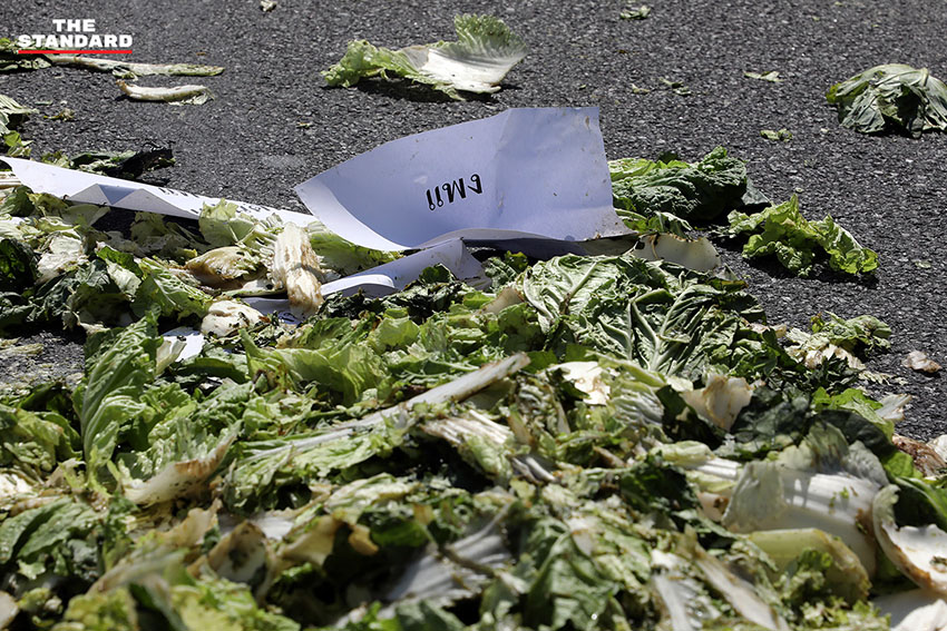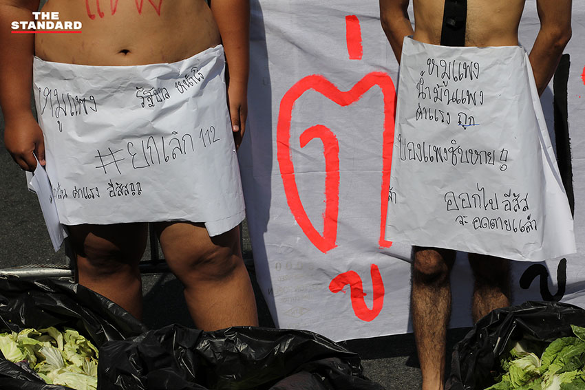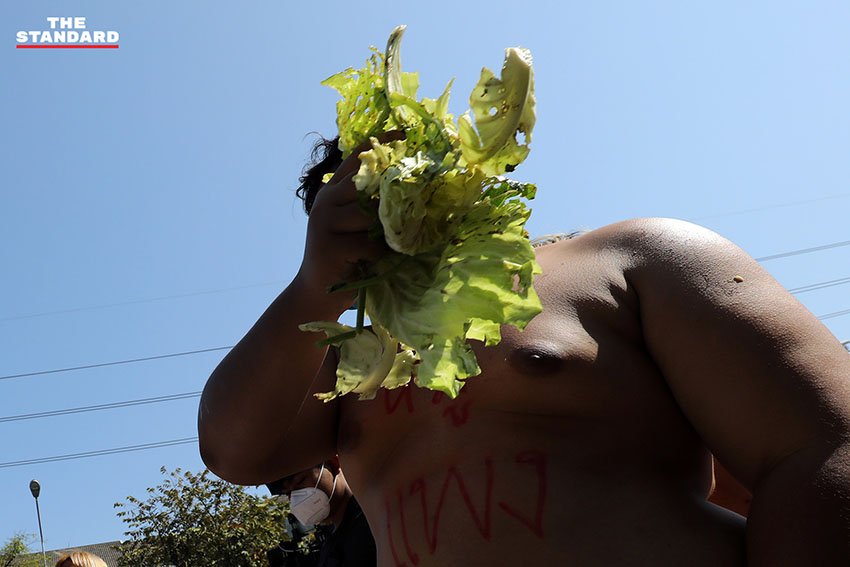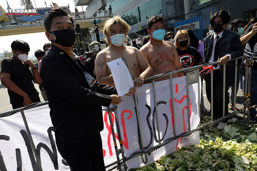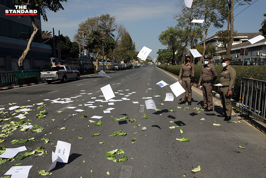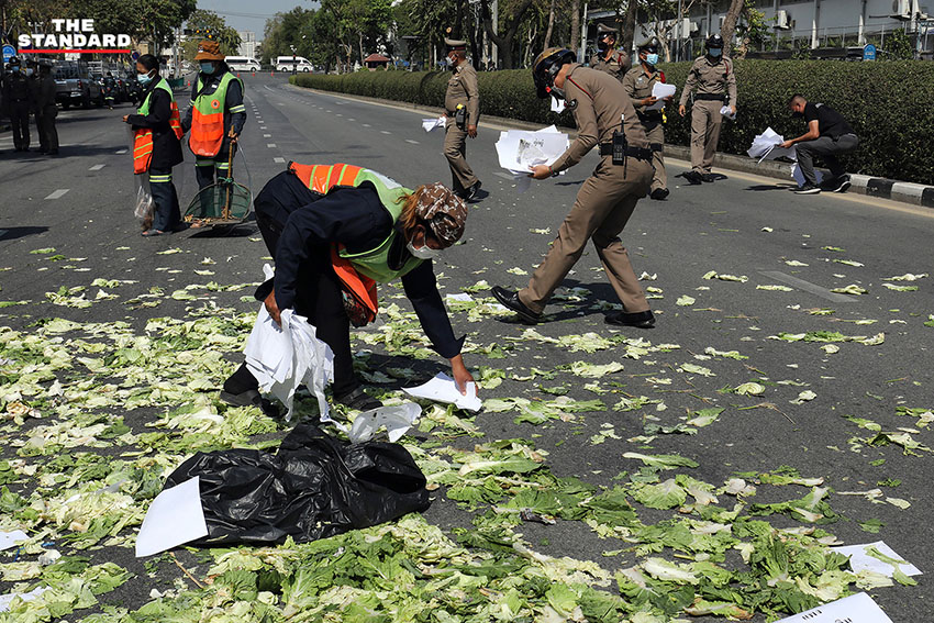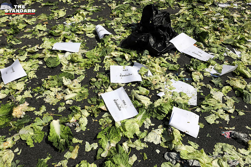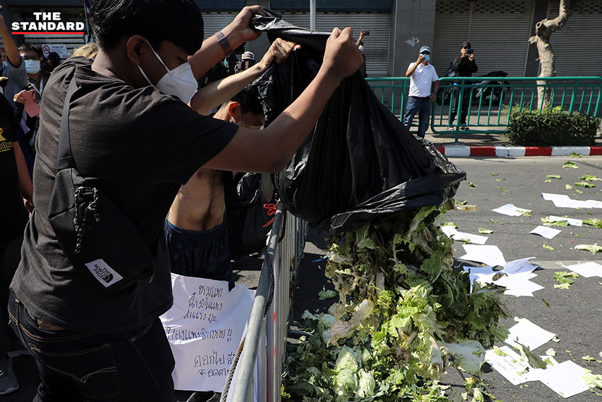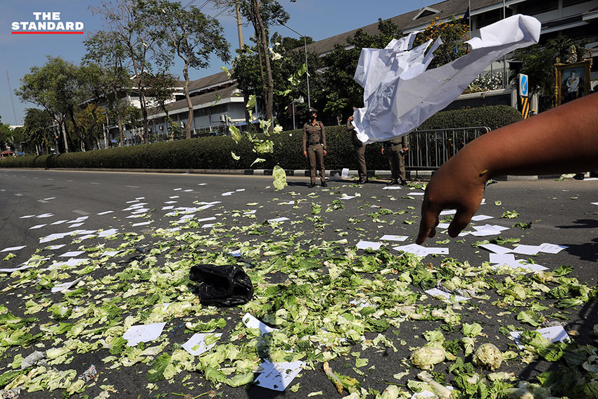 จากนั้นตัวแทนกลุ่มได้ทำกิจกรรมเชิงสัญลักษณ์ ได้โยนผักที่เป็นอาหารหมู และโปรยใบปลิวที่มีข้อความว่า ‘แพงทั้งแผ่นดิน’ เข้าไปในแนวรั้วกั้นของเจ้าหน้าที่ตำรวจ