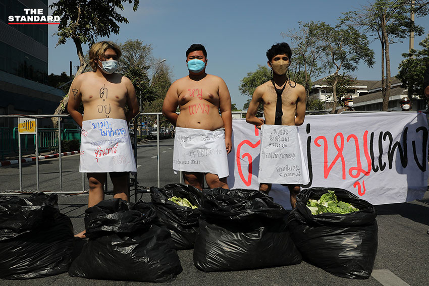 วันนี้ (19 มกราคม) เครือข่ายรามคำแหงเพื่อประชาธิปไตย ทำกิจกรรม ‘ตู่อยู่หมูแพง #แพงทั้งแผ่นดิน’ บริเวณหน้าทำเนียบรัฐบาล