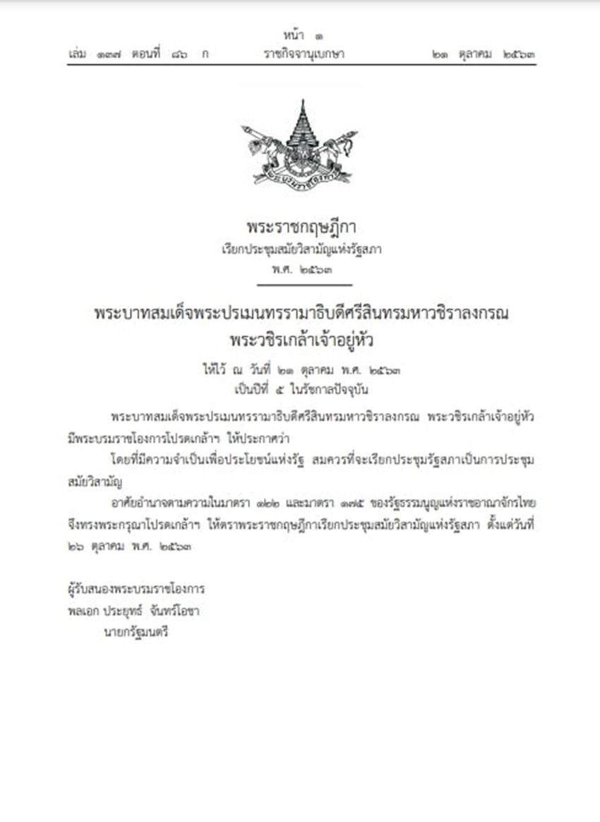เว็บไซต์ราชกิจจานุเบกษา เผยแพร่ประกาศพระราชกฤษฎีกาเรียกประชุมสมัยวิสามัญแห่งรัฐสภา พ.ศ. 2563 ลงวันที่ 21 ตุลาคม 2563 ระบุว่า พระบาทสมเด็จพระปรเมนทรรามาธิบดีศรีสินทรมหาวชิราลงกรณ พระวชิรเกล้าเจ้าอยู่หัว มีพระบรมราชโองการโปรดเกล้าฯ ให้ประกาศว่า โดยที่มีความจำเป็นเพื่อประโยชน์แห่งรัฐ สมควรที่จะเรียกประชุมรัฐสภาเป็นการประชุมสมัยวิสามัญ อาศัยอำนาจตามความในมาตรา 122 และมาตรา 175 ของรัฐธรรมนูญแห่งราชอาณาจักรไทย จึงทรงพระกรุณาโปรดเกล้าฯ ให้ตราพระราชกฤษฎีกาเรียกประชุมสมัยวิสามัญแห่งรัฐสภา ตั้งแต่วันที่ 26 ตุลาคม พ.ศ. 2563 โดยมี พล.อ. ประยุทธ์ จันทร์โอชา นายกรัฐมนตรี เป็นผู้สนองพระบรมราชโองการ