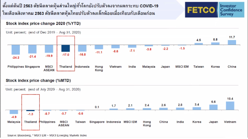 ไพบูลย์ นลินทรางกูร ประธานกรรมการสภาธุรกิจตลาดทุนไทย (FETCO) กล่าวว่าตลาดหุ้นไทยในปัจจุบันยังติดลบ 17% เมื่อเทียบกับช่วงต้นปี 2563 ที่ผ่านมา ส่วนหนึ่งแม้ว่าจะได้รับผลกระทบจากโควิด-19 เหมือนทั่วโลก แต่ยังเห็นตลาดหุ้นบางประเทศเริ่มฟื้นตัว เช่น ไต้หวัน (4.5%) เกาหลีใต้ (5.8%) และจีน (11.7%)