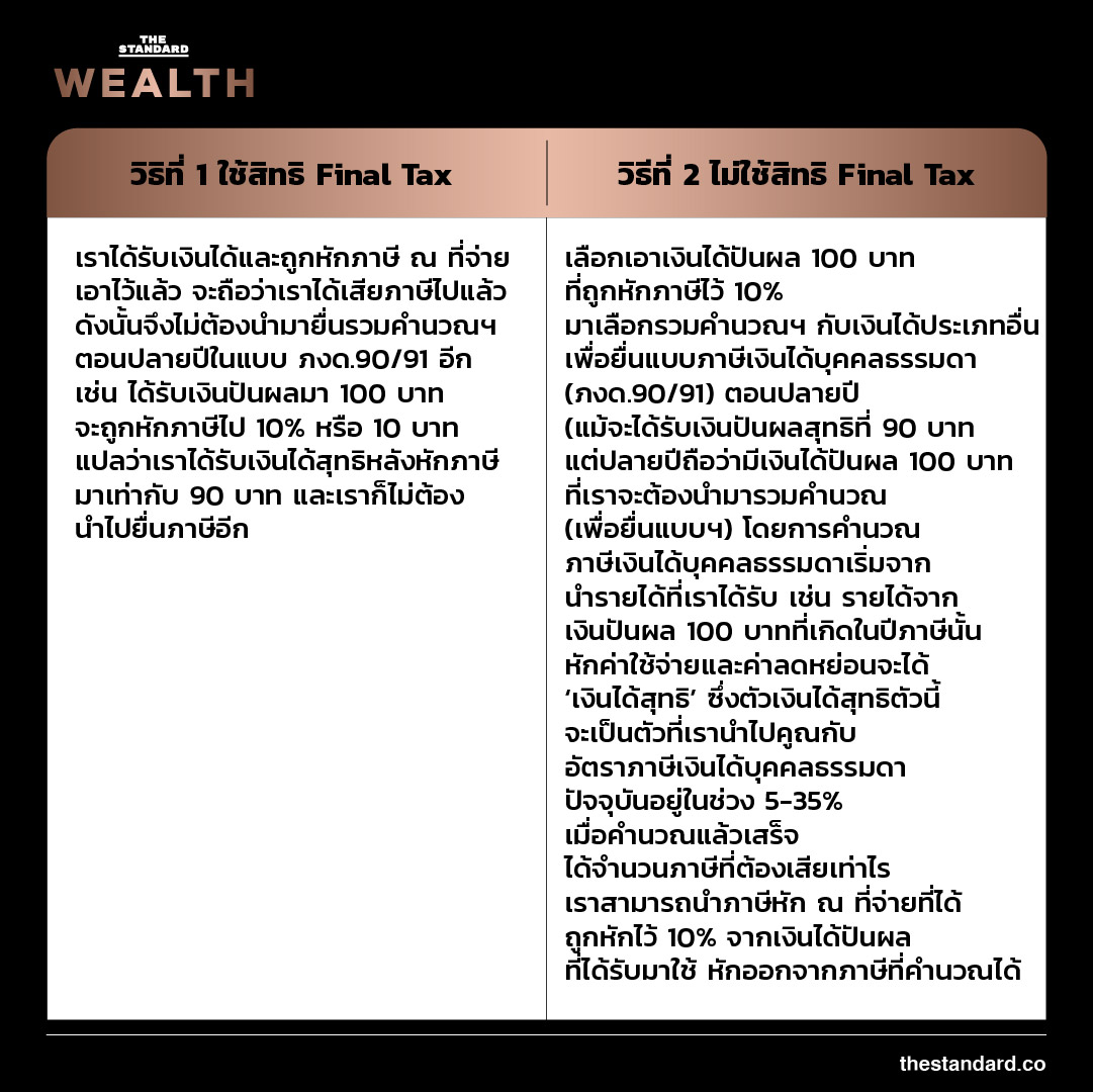 - ทางเลือกที่ 1 Final Tax นั่นคือถูกหักภาษีไปแล้ว ไม่ต้องนำมาคำนวณเป็นเงินได้ตอนปลายปีอีก