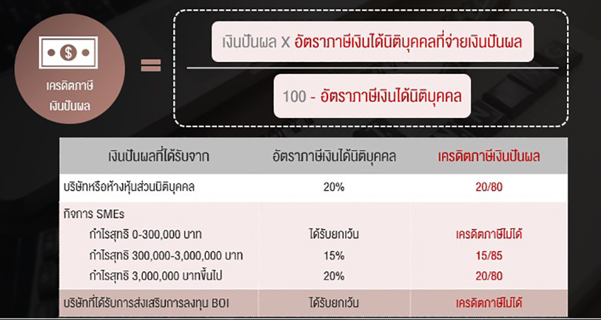 ต่อมาเราจะมาคุยถึงเรื่องการใช้เครดิตภาษีเงินปันผลที่ได้รับจากหุ้น หลักการของ ‘เครดิตภาษีเงินปันผล’ เกิดจากแนวคิดเรื่องการจัดเก็บภาษีเพื่อไม่ให้เกิดความซ้ำซ้อน เนื่องจากรัฐมองว่าเงินได้ก้อนนี้ได้เคยถูกจัดเก็บภาษีเงินได้นิติบุคคล (จากกำไรสุทธิของบริษัท) ไปแล้วรอบหนึ่ง และเมื่อต่อมาบริษัทได้มีการจ่ายเงินปันผลออกมาจากกำไรนั้นให้แก่ผู้ถือหุ้น ซึ่งผู้ถือหุ้นก็ต้องเสียภาษีเงินได้บุคคลธรรมดาอีกจากเงินได้ก้อนเดียวกัน (กรณีที่บุคคลธรรมดาเลือกที่จะนำมารวมคำนวณฯ) เช่น บริษัท (นิติบุคคล) มีกำไร มีหน้าที่จะต้องเสียภาษีเงินได้นิติบุคคล (อัตราภาษีเงินได้นิติบุคคล 20%) กำไรหลังหักภาษีตรงนี้จะถูกนำมาจ่ายปันผลให้ผู้ถือหุ้น (บุคคลธรรมดา) เมื่อมีการจ่ายปันผลให้บุคคลธรรมดา บริษัทจะต้องหักภาษี ณ ที่จ่ายไว้ 10% นี่คือความซ้ำซ้อนของการจัดเก็บภาษีเงินได้ ดังนั้นจึงได้มีหลักการของ ‘เครดิตภาษีเงินปันผล’ มาเป็นตัวขจัดความซ้ำซ้อนดังกล่าวนั่นเอง