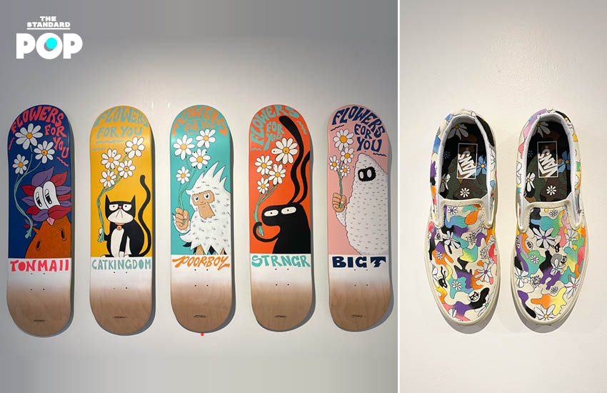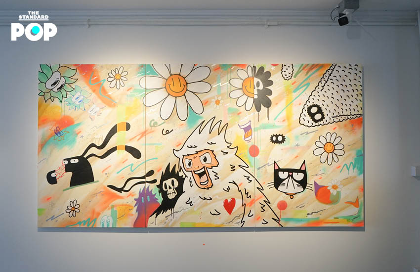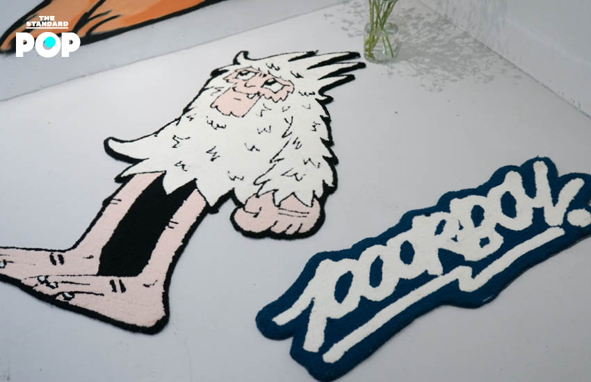 นอกจากงานเพนต์บนผนังและเฟรมขนาดต่างๆ แล้ว ก็ยังมีงานคาแรกเตอร์ POORBOY บนมีเดียมต่างๆ มาเสริมความสนุก ตั้งแต่พรมหน้างาน งานเพนต์บนรองเท้าผ้าใบ งานฟิกเกอร์ (ที่น่ารักมากๆ และชิ้นนี้ไม่เปิดขายด้วย) รวมถึงลวดลายบนสเกตบอร์ด เหมือนเชื้อเชิญให้เราสนุกไปกับการทำความรู้จักเจ้า POORBOY ผ่านไลฟ์สไตล์ของน้องไปพร้อมๆ กัน ถึงจะเป็นมินิโชว์ แต่ก็ถือเป็นชุดงานที่ทำให้คุณยิ้มได้ง่ายๆ เหมือนกับที่คุณต้นตั้งใจ