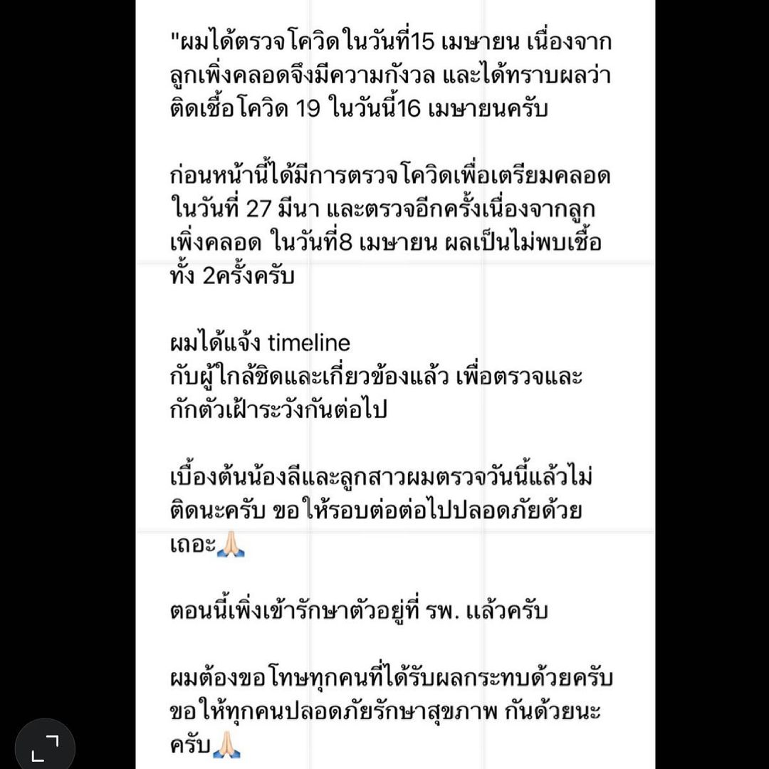 “ผมได้ตรวจโควิด-19 ในวันที่ 15 เมษายน เนื่องจากลูกเพิ่งคลอด จึงมีความกังวล และได้ทราบผลว่าติดโควิด-19 ในวันนี้ 16 เมษายนครับ