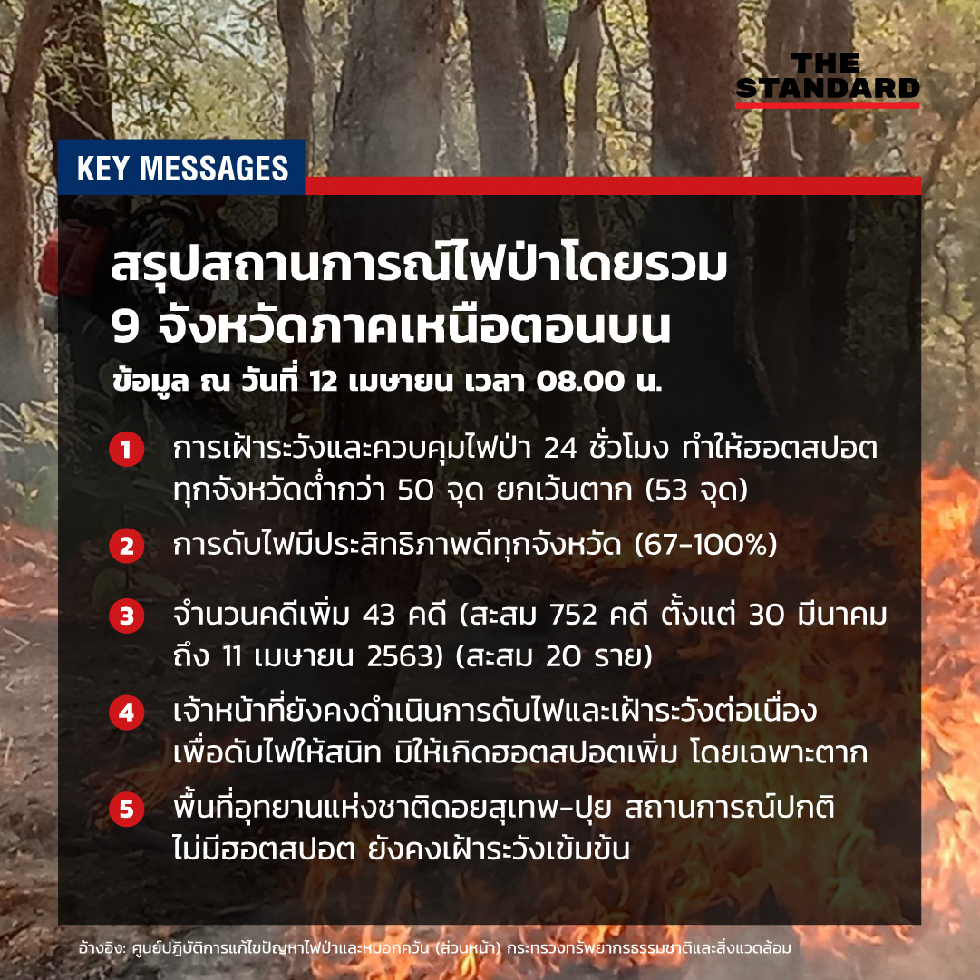ศูนย์ปฏิบัติการแก้ไขปัญหาไฟป่าและหมอกควัน (ส่วนหน้า) กระทรวงทรัพยากรธรรมชาติและสิ่งแวดล้อม รายงานภาพรวม 9 จังหวัดภาคเหนือตอนบน ได้แก่ เชียงราย, เชียงใหม่, แม่ฮ่องสอน, ลำปาง, ลำพูน, พะเยา, แพร่, น่าน และตาก มีรายละเอียด ณ วันที่ 12 เมษายน เวลา 08.00 น. ดังนี้