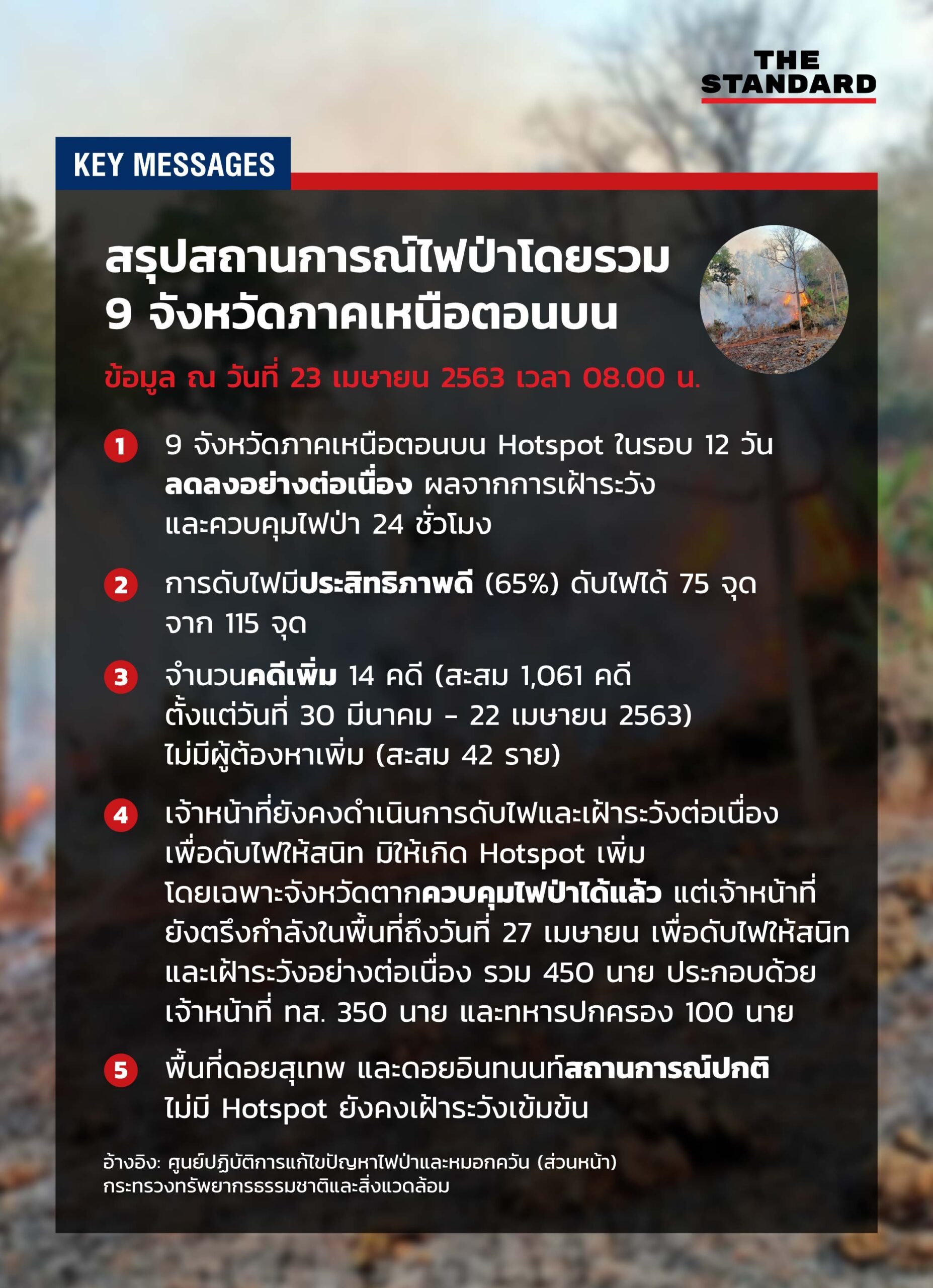 ศูนย์ปฏิบัติการแก้ไขปัญหาไฟป่าและหมอกควัน (ส่วนหน้า) กระทรวงทรัพยากรธรรมชาติและสิ่งแวดล้อม รายงานภาพรวม 9 จังหวัดภาคเหนือตอนบน ได้แก่ เชียงราย, เชียงใหม่, แม่ฮ่องสอน, ลำปาง, ลำพูน, พะเยา, แพร่, น่าน และตาก มีรายละเอียด ณ วันที่ 23 เมษายน 2563 เวลา 08.00 น. ดังนี้