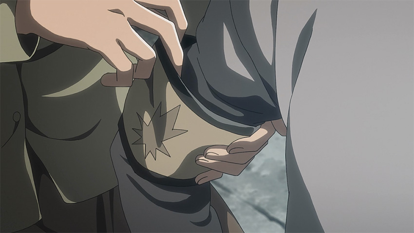 การมาเยือนของ ‘ปีศาจบนเกาะ’ ทำให้เพื่อนร่วมชั้นของกาบิถูกหินจากแรงระเบิดหล่นทับจนตาย ส่วนอีกคนที่พยายามเข้าไปช่วยก็โดนผู้คนที่แตกตื่นวิ่งเหยียบซ้ำไปซ้ำมาจนหัวแตก