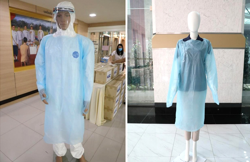 นอกจากนี้ GC ยังทำการส่งมอบเสื้อกาวน์แบบใช้ครั้งเดียวทิ้ง (Disposable Gown) ผลิตจากเม็ดพลาสติกชนิดโพลีเอทิลีนคุณภาพดี มีคุณสมบัติเฉพาะตัว คือ น้ำหนักเบา ระบายอากาศได้ดี มีความเหนียว มีความยืดหยุ่นสูง สามารถป้องกันเชื้อโรค เลือด และสารคัดหลั่ง พร้อมออกแบบตัดเย็บให้มีปลายแขนยาว ทำให้บุคลากรทางการแพทย์สวมใส่ได้สบาย เกิดความคล่องตัวในขณะปฏิบัติงาน โดยเฉพาะบริเวณจุดคัดกรอง ซึ่งถือเป็นด่านแรกรับผู้ป่วยของโรงพยาบาล ท่ามกลางสถานการณ์จำนวนยอดผู้ป่วยติดเชื้อสูงขึ้นทุกวันได้เป็นอย่างดี ปัจจุบันเสื้อกาวน์แบบใช้ครั้งเดียวทิ้งจำนวน 41,000 ชุด ได้ถูกส่งมอบให้กับ 12 โรงพยาบาล ทั้งในเขตกรุงเทพมหานคร ชลบุรี และระยองเป็นที่เรียบร้อย