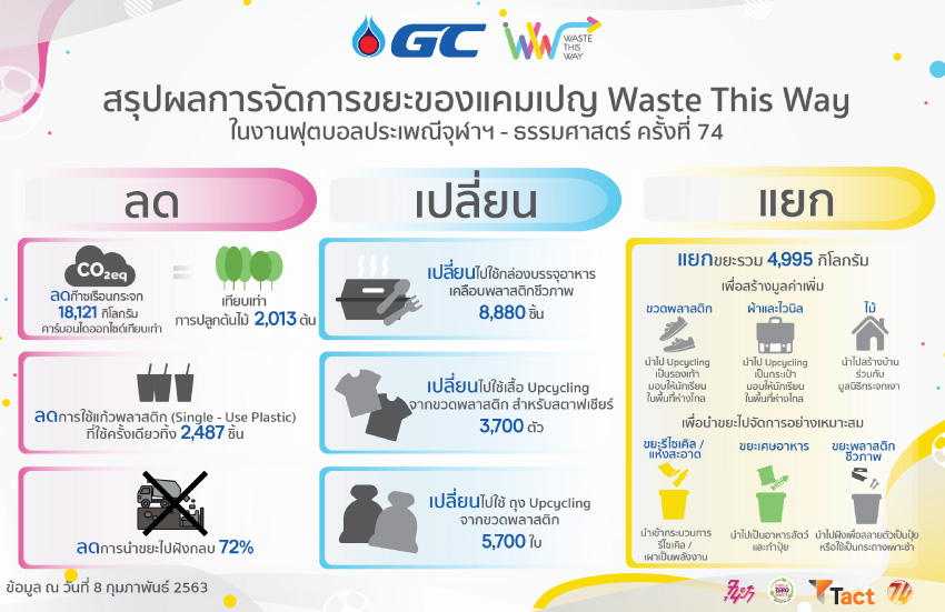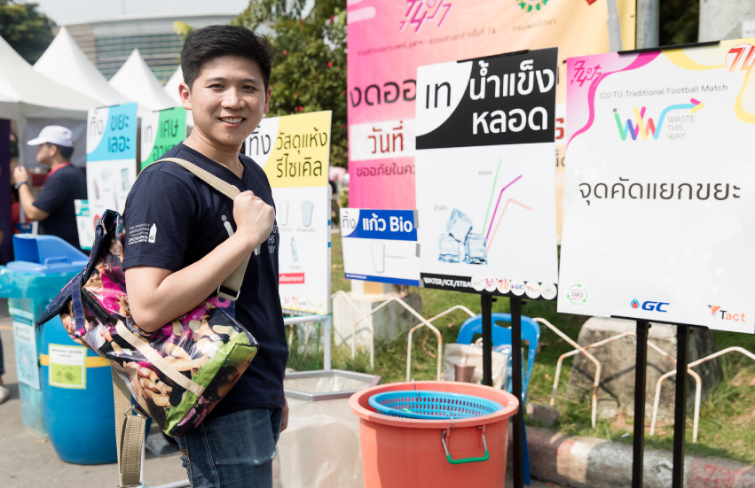 งานฟุตบอลประเพณีจุฬาฯ-ธรรมศาสตร์ ครั้งที่ 74 ที่เพิ่งจบลงไป นับเป็นอีเวนต์ใหญ่ครั้งแรกระดับประเทศ ที่เป็นการจับมือร่วมกันของจุฬาลงกรณ์มหาวิทยาลัย และมหาวิทยาลัยธรรมศาสตร์ ในการร่วมแสดงพลังให้เกิดการเปลี่ยนแปลงในเรื่องของสิ่งแวดล้อมครั้งสำคัญ ด้วยการจัดการอุปกรณ์และข้าวของเครื่องใช้ทั้งหมดในงาน ให้มีทางไปต่อ ไม่ให้เกิดการสูญเปล่า และไม่เหลือเศษขยะไว้ข้างหลังเลยแม้สักชิ้น ผลงานชิ้นโบแดงจากแคมเปญ ‘Waste This Way’ โดย บริษัท พีทีที โกลบอล เคมิคอล จำกัด (มหาชน) หรือ GC ร่วมมือกับ แม็กซ์-ชยุตม์ สกุลคู ผู้ก่อตั้งบริษัท TACT Social Consulting ที่ปรึกษาด้าน CSR ที่มุ่งมั่นสร้างความยั่งยืนผ่านพลังคนรุ่นใหม่ เพื่อปลูกจิตสำนึกรักษ์โลก สร้างความตระหนักรู้และความเข้าใจเกี่ยวกับปัญหาขยะออกไปสู่สังคมอย่างครบวงจร