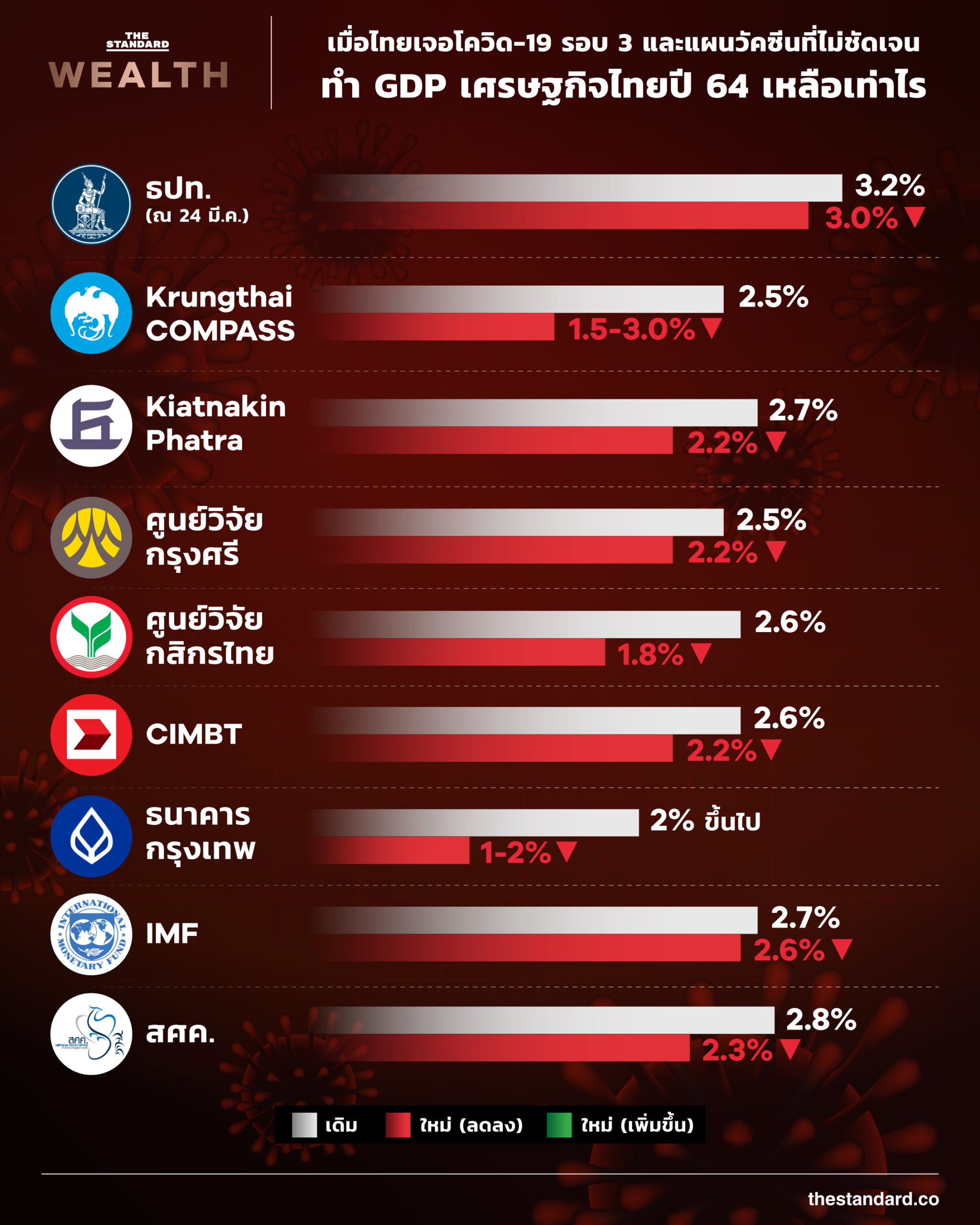 จากวิกฤตโควิด-19 เมื่อปี 2563 ทำให้หลายฝ่ายคาดว่าปี 2564 เศรษฐกิจไทยจะเริ่มฟื้นตัว แต่เมื่อเกิดการระบาดระลอกที่ 2 และ 3 ขึ้น ทำให้นักวิเคราะห์และหน่วยงานต่างๆ ปรับลด GDP ปีนี้ลง แต่จะเหลือเท่าไรกันบ้าง