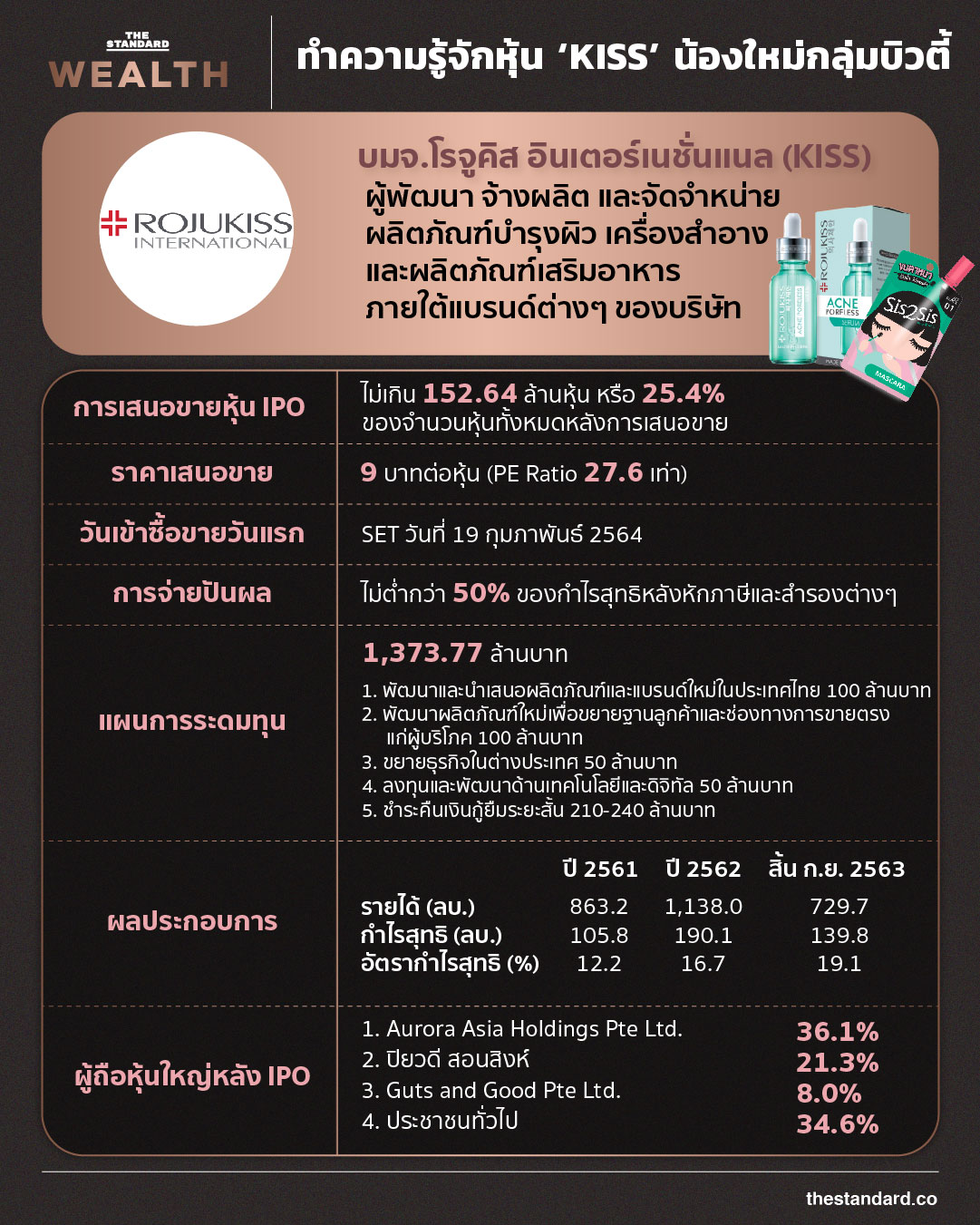หุ้น ‘KISS’ เจ้าของแบรนด์ Rojukiss, PhDerma, Best Korea, Wonder Herb และ Sis2Sis เตรียมเข้าซื้อขายในตลาดหลักทรัพย์แห่งประเทศไทยวันแรก 19 กุมภาพันธ์นี้ ด้วยราคา IPO ที่ 9 บาทต่อหุ้น เงินระดมทุนกว่า 1.37 พันล้านบาท เตรียมนำไปลงทุนพัฒนาและสร้างแบรนด์ใหม่ ขยายช่องทางการจัดจำหน่าย และขยายธุรกิจในต่างประเทศ