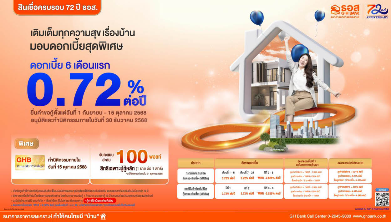 ธนาคารอาคารสงเคราะห์ (ธอส.) ฉลองวาระครบ 6 รอบ 72 ปี ด้วยการเปิดตัวแคมเปญสินเชื่อบ้านอัตราดอกเบี้ยต่ำพิเศษ ‘สินเชื่อบ้าน 72 ปี ธอส.’ กรอบวงเงินรวม 27,000 ล้านบาท ให้สิทธิ์ดอกเบี้ยต่ำต่อเนื่องยาวนานถึง 6 ปี เอื้อต่อการมีบ้านในช่วงภาระค่าครองชีพสูง