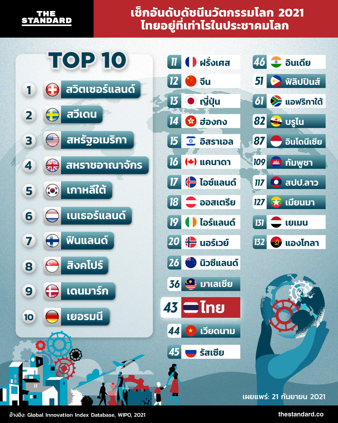 จากรายงานดัชนีนวัตกรรมโลก 2021 ที่เผยแพร่โดย Cornell University, องค์กร INSEAD, องค์การทรัพย์สินทางปัญญาแห่งโลก (WIPO) และพันธมิตร หลังจากสำรวจข้อมูลด้านนวัตกรรมในมิติต่างๆ ใน 132 ประเทศและเขตเศรษฐกิจ