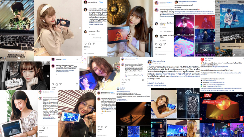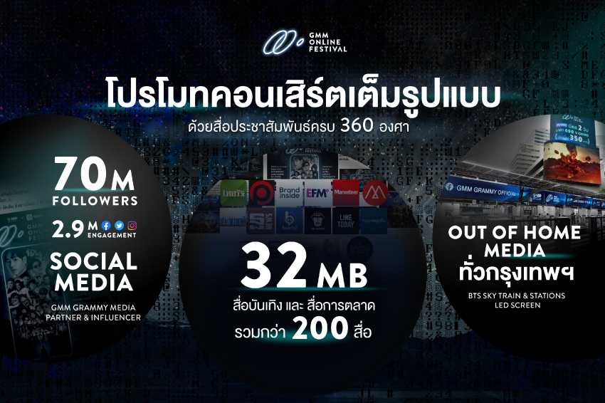 • ความสำเร็จของ GMM Online Festival ถูกยืนยันด้วยผลลัพธ์ที่หลากหลาย ไม่ว่าจะเป็นสื่อบันเทิงและสื่อการตลาดต่างๆ จํานวนกว่า 200 สื่อที่ให้การตอบรับและร่วมประชาสัมพันธ์ จนก่อให้เกิด Media Value ที่ประเมินออกมาแล้วมีมูลค่ามากถึง 32 ล้านบาท หรือการประชาสัมพันธ์ผ่านช่องทางโซเชียลมีเดีย ทั้ง GMM Grammy Official ค่ายเพลง ศิลปินในสังกัด และพาร์ตเนอร์ต่างๆ ฟอลโลเวอร์รวมกว่า 70 ล้าน จนเกิดเอ็นเกจเมนต์รวมทั้งสิ้นกว่า 2.9 ล้าน