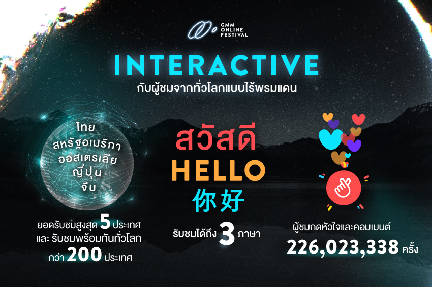 • การสร้างประสบการณ์ที่แตกต่างและสมบูรณ์ด้วย Interactive ส่งมอบความสุขให้กับผู้ชมจากกว่า 200 ประเทศ มีการกดหัวใจและคอมเมนต์จากผู้ชมเพื่อเป็นกำลังใจให้ศิลปินถึงกว่า 226,000,000 ครั้ง