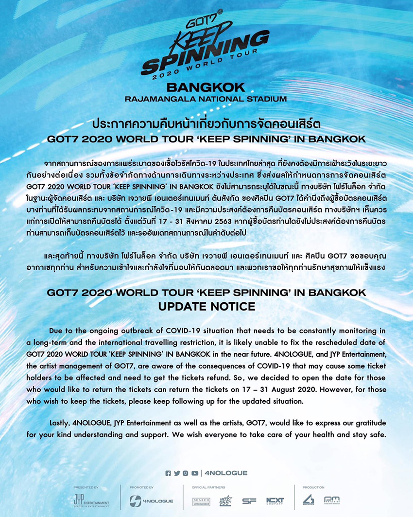 ดูเหมือนว่าแฟนคลับ GOT7 อาจจะต้องรอหนุ่มๆ กันอีกพักใหญ่สำหรับคอนเสิร์ต GOT7 2020 World Tour ‘Keep Spinning’ in Bangkok หลังจากที่มีประกาศเลื่อนการจัดคอนเสิร์ตในประเทศไทยออกไปอย่างไม่มีกำหนดเมื่อช่วงเดือนมีนาคมที่ผ่านมา เนื่องจากสถานการณ์โควิด-19 ที่กำลังแพร่ระบาดไปทั่วโลก