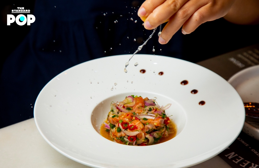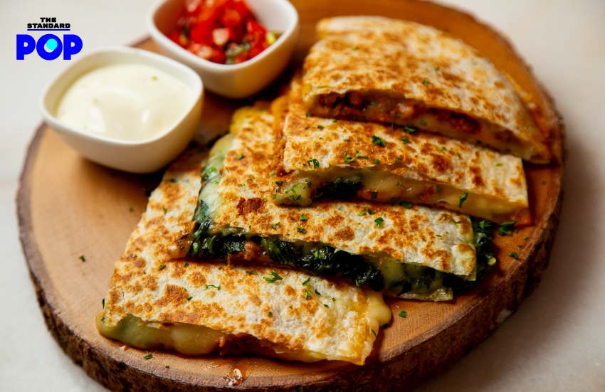 อาหารที่เสิร์ฟในร้านเป็นอาหารนานาชาติ ทั้งอาหารไทยและอาหารตะวันตก เริ่มที่เมนูกินเล่นเรียกน้ำย่อยอย่าง เกซาดิยา (220 บาท) อาหารเม็กซิกันที่เหมาะกับการสั่งมาแชร์กันบนโต๊ะ เป็นแผ่นแป้งตอร์ติยา 2 แผ่นสอดไส้ชีส ครึ่งหนึ่งจะเป็นชีสหมูผัดซอส และอีกครึ่งหนึ่งจะเป็นชีสผักโขม ยำแซลมอน (195 บาท) ปลาแซลมอนเนื้อเด้งหั่นพอดีคำ คลุกเคล้ากับน้ำยำ เครื่องสมุนไพรจนน้ำยำซึมซับเข้าไปในเนื้อปลา รสชาติจัดจ้านสไตล์ไทยๆ
