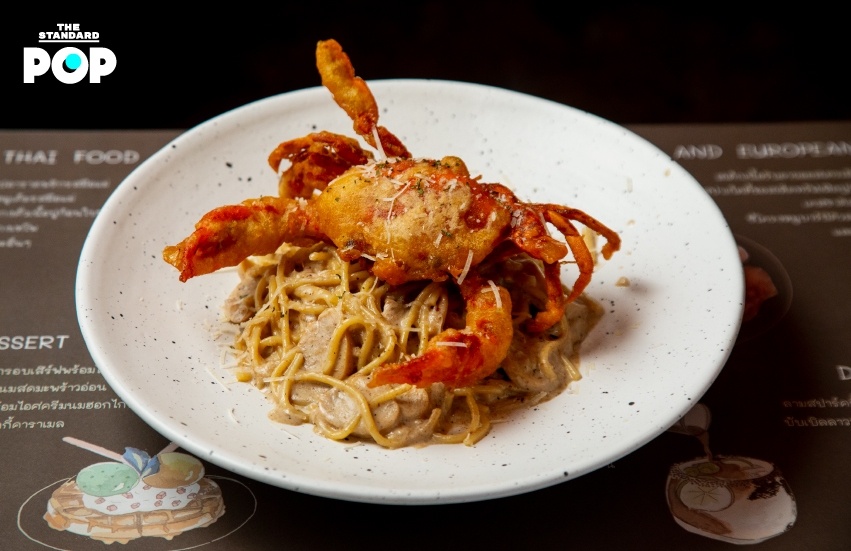 ส่วนอาหารจานหลักก็มีทั้งอาหารไทยอย่าง แกงคั่วเนื้อปูใบชะพลูเส้นหมี่ (320 บาท) รสชาติจัดจ้าน ได้ปูเป็นก้อน สปาเกตตีซอสครีมเห็ดทรัฟเฟิลปูนิ่ม (350 บาท) เส้นสปาเกตตีคลุกเคล้าซอสครีมเห็ดทรัฟเฟิลชุ่มฉ่ำ หอมทรัฟเฟิลเข้มข้น ด้านบนมีปูนิ่มทั้งตัว และ สเต๊กเนื้อวากิวริบอาย (950 บาท) ที่ใช้เนื้อนำเข้าจากออสเตรเลีย ตัวเนื้อมีไขมันแทรกระหว่างกล้ามเนื้อสูง ย่างมาชุ่มฉ่ำกำลังดี เสิร์ฟพร้อมมันบดร้อนและซอสสูตรพิเศษของทางร้าน