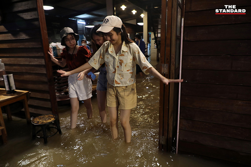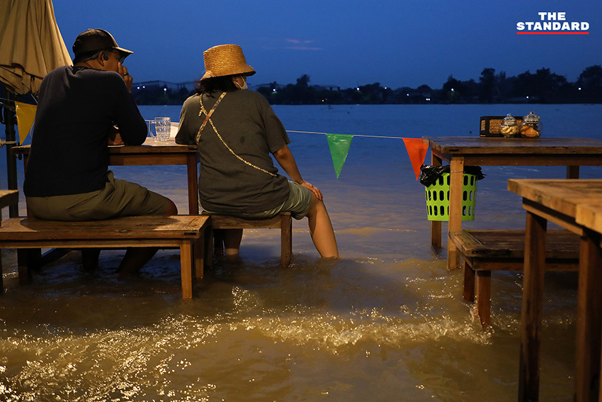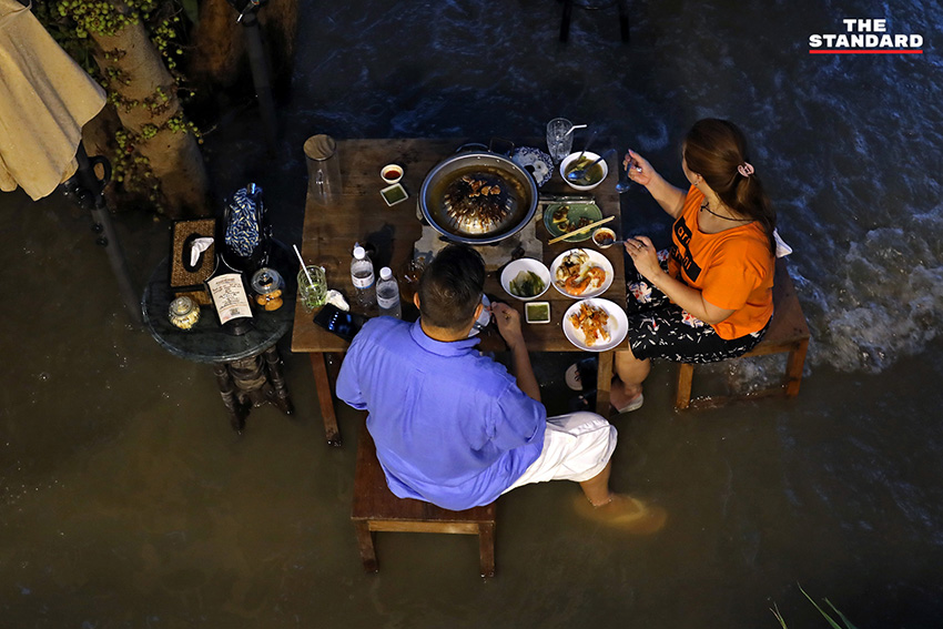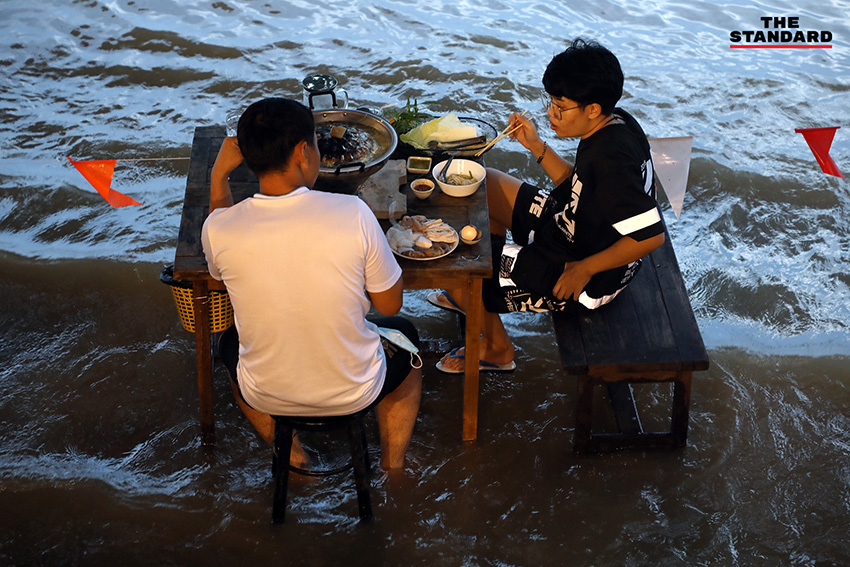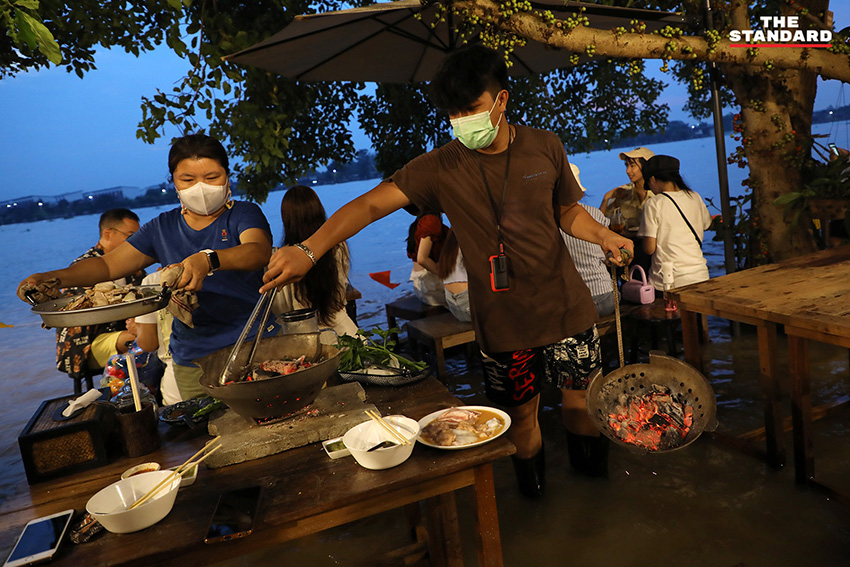 วันนี้ (8 ตุลาคม) THE STANDARD เดินทางไปสำรวจบรรยากาศดังกล่าว เราพบว่า มีลูกค้าเดินทางมาอุดหนุนอย่างต่อเนื่อง ขณะที่ไฮไลต์สำคัญคือ ‘คลื่นน้ำ’ ที่ซัดเข้ามายังจุดที่นั่งกินหมูกระทะ ซึ่งลูกค้าต้องคอยหลบหรือรับมือกับการย่างหมูกระทะที่กำลังออกรสชาติ