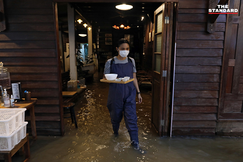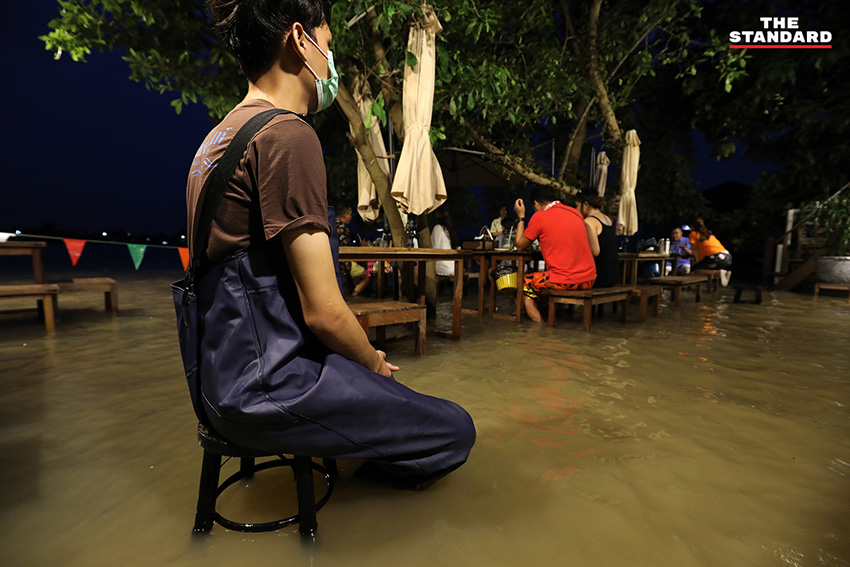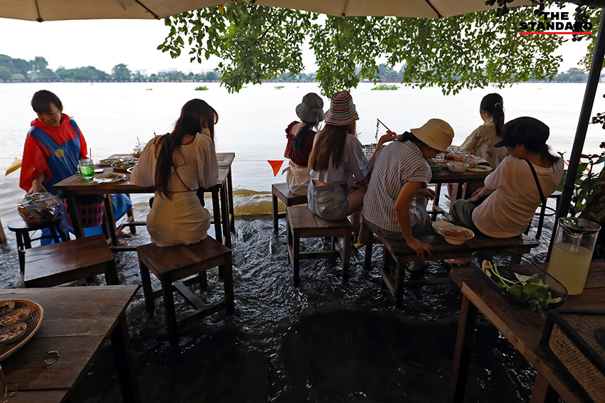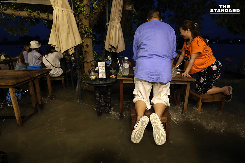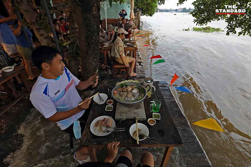 พนักงานคนหนึ่งเล่าให้ฟังว่า ปีนี้น้ำเอ่อหนุนสูงกว่าทุกปี ทำให้เราต้องปรับตัวเพื่อทำธุรกิจ โดยจะเปิดให้บริการสองรอบคือ รอบเที่ยงและรอบเย็น โดยอาหารสองรอบต่างกัน ที่เป็นกระแสคือหมูกระทะ ประจวบกับน้ำเอ่อ น้ำลนตลิ่ง เวลาเรือด่วนวิ่งให้บริการผ่านมาทำให้เกิดคลื่น จึงเกิดเป็นไวรัลขึ้นมา ลูกค้าต้องลุกมาช่วยกันจัดโต๊ะ เลยกลายเป็นความสนุกสนานของลูกค้า และเราก็มีความสุขไปกับลูกค้าด้วย โดยแต่ละวันมีการจองเข้ามาช่วงนี้เยอะมาก โต๊ะเต็มทุกวัน บางคนมีงอนเรากลับไปเพราะ Walk-in เข้ามา แต่โต๊ะเรามีจำนวนจำกัด โดยส่วนที่เป็นหมูกระทะโต้คลื่นนั้นจะมีบริการเพียง 10 โต๊ะ แต่ยังมีส่วนที่นั่งให้บริการหมูกระทะอื่นๆ ด้วย