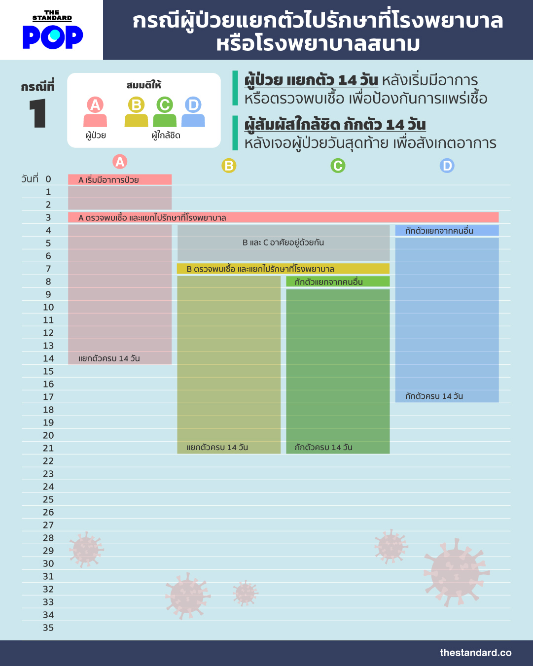 • คำอธิบายชาร์ต: เมื่อ A เริ่มมีอาการป่วย A วันที่เริ่มมีอาการจะนับว่าเป็นวันที่ 0 และจะเริ่มนับวันที่ 1 ในวันถัดไปต่อจนครบ 14 วัน ในกรณีนี้ A ตรวจพบเชื้อ และแยกไปรักษาที่โรงพยาบาลในวันที่ 3