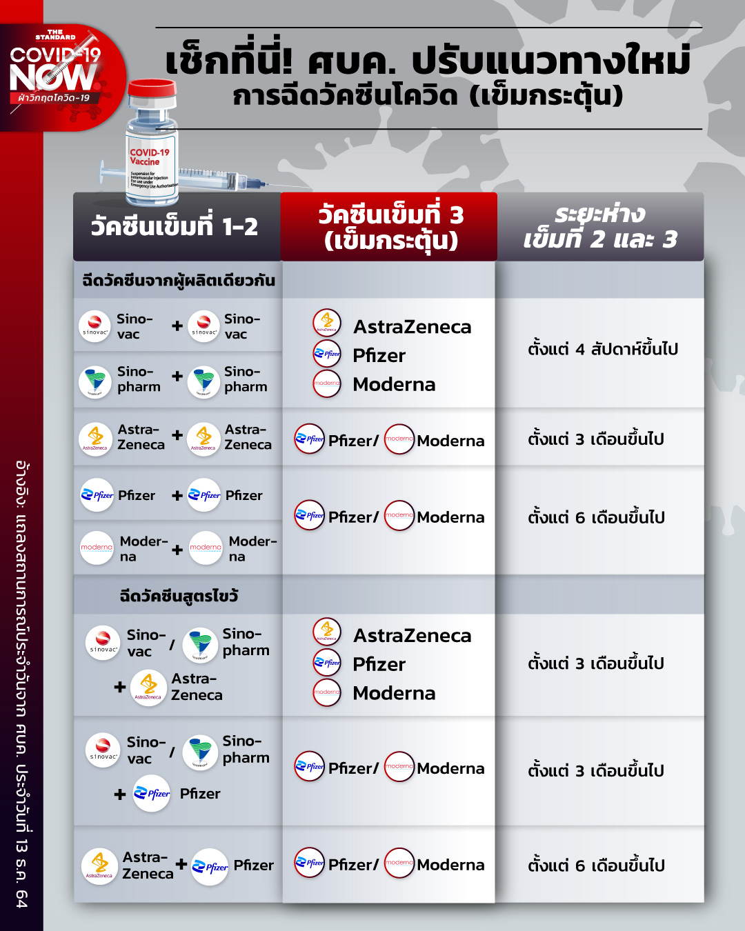 วันนี้ (13 ธันวาคม) จากการแถลงข่าวของศูนย์บริหารสถานการณ์โควิด-19 (ศบค.) นพ.ทวีศิลป์ วิษณุโยธิน เปิดเผยมติที่ประชุมคณะอนุกรรมการสร้างเสริมภูมิคุ้มกันโรค ครั้งที่ 9/2564 เกี่ยวกับคำแนะนำวัคซีนโควิดเข็มกระตุ้นว่า ตอนนี้มีการปรับระยะเวลาการฉีดวัคซีนเข็มที่ 3 (เข็มกระตุ้น) เป็นแนวทางใหม่ ในกรอบเวลาที่เร็วขึ้น