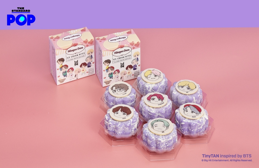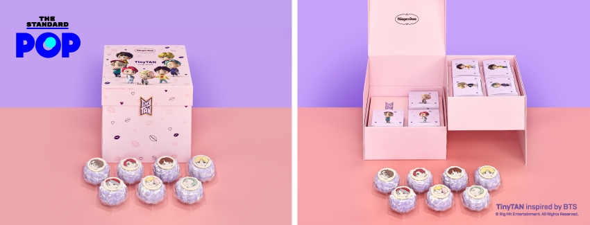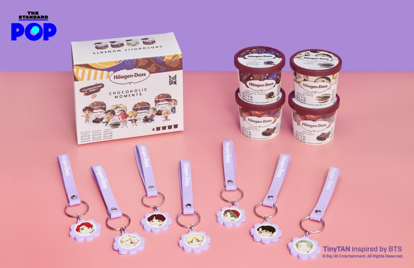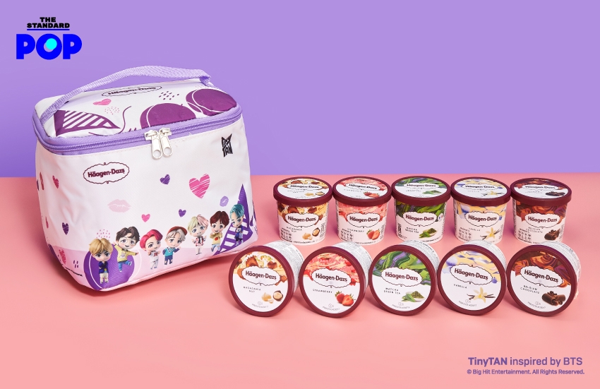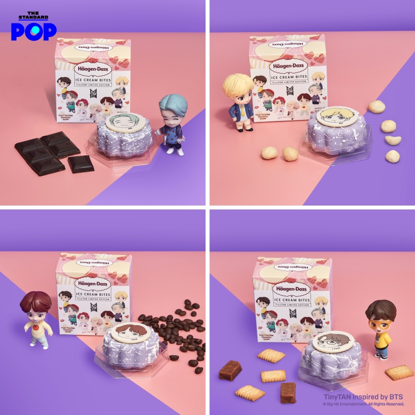 สนุกกว่าเดิมด้วย Häagen-Dazs TinyTAN มินิคัพ ปาร์ตี้แพ็ก (1,090 บาท) ไอศกรีมมินิคัพ 10 ถ้วย บรรจุมาในกระเป๋าเก็บความเย็นรุ่นพิเศษ ตกแต่งด้วยคาแรกเตอร์การ์ตูน TinyTAN และรูปหัวใจสีชมพูและสีม่วง ซึ่งได้รับการออกแบบมาโดยเฉพาะของ TinyTAN เมื่อเปิดกระเป๋าออกมาจะพบกับไอศกรีมรสชาติยอดนิยมที่สุดของ Häagen-Dazs ไม่ว่าจะเป็นรสเบลเยียมช็อกโกแลต รสวานิลลา รสแมคคาเดเมียนัท รสกรีนที และรสสตรอว์เบอร์รี หาซื้อได้ที่ร้านค้าชั้นนำ ตั้งแต่วันที่ 25 พฤศจิกายนเป็นต้นไป