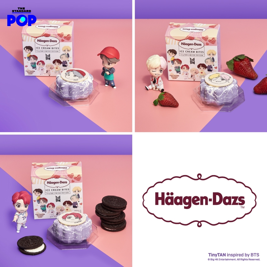 มาถึงไฮไลต์ที่พิเศษที่สุดสำหรับการ Collaboration กับ TinyTAN ในครั้งนี้ กับผลิตภัณฑ์พิเศษ ไอศกรีมไบต์ (ชิ้นละ 139 บาทต่อกิฟต์เซ็ต 1,990 บาท) ไอศกรีม Häagen-Dazs เคลือบด้วยช็อกโกแลตสีม่วง ปิดท้ายด้วยแผ่นช็อกโกแลตกรุบกรอบพิมพ์ลายคาแรกเตอร์ทั้ง 7 ของ TinyTAN รสชาติของไอศกรีมไบต์จะแตกต่างกันตามแต่ละคาแรกเตอร์ อย่างเช่น RM กับรสช็อกโกแลต Jin กับรสแมคคาเดเมียนัท SUGA กับรสกาแฟ J-Hope กับรสคาราเมลบิสกิตแอนด์ครีม Jimin กับรสวานิลลา V กับรสสตรอว์เบอร์รี และ Jungkook กับรสคุกกี้แอนด์ครีม