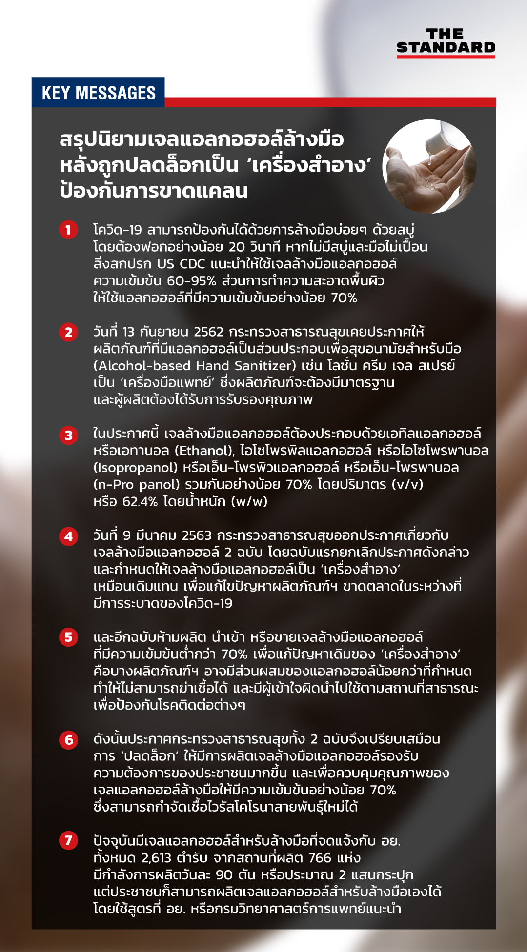 - ดังนั้นประกาศกระทรวงสาธารณสุขทั้ง 2 ฉบับจึงเปรียบเสมือนการ ‘ปลดล็อก’ ให้มีการผลิตเจลล้างมือแอลกอฮอล์รองรับความต้องการของประชาชนมากขึ้น และเพื่อควบคุมคุณภาพของเจลแอลกอฮอล์ล้างมือให้มีความเข้มข้นอย่างน้อย 70% ซึ่งสามารถกำจัดเชื้อไวรัสโคโรนาสายพันธุ์ใหม่ได้