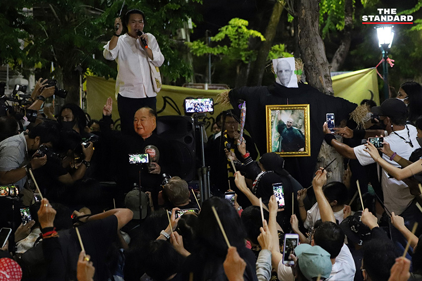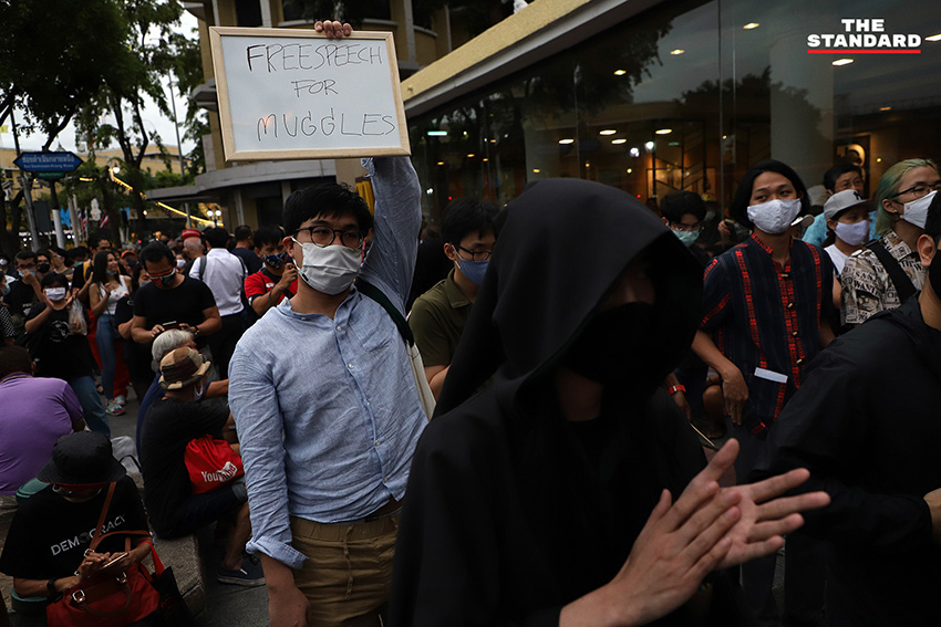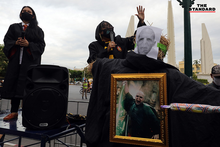 ขณะที่เมื่อถึงเวลาเริ่มกิจกรรม ผู้ปราศรัยรายแรกที่แต่งชุดพ่อมดได้กล่าวถึงวรรณกรรมเรื่องนี้ โดยเล่าถึงพ่อมดแม่มดวัยหนุ่มสาวที่ต่อสู้กับเครือข่ายจอมมารไม่ให้ครอบงำโลกเวทมนตร์ได้สำเร็จ จากนั้นก็ได้ทิ้งท้ายด้วยการเสกคาถา ‘เอกซ์เปกโต พาโตรนุม’ และขอให้นึกถึงรอยยิ้มของ วันเฉลิม สัตย์ศักดิ์สิทธิ์ นักกิจกรรมชาวไทยที่หายตัวไปในประเทศกัมพูชา และให้ผู้ชุมนุมเปล่งคาถาโดยพร้อมเพรียงกัน
