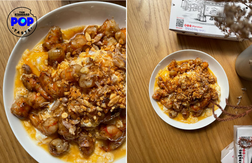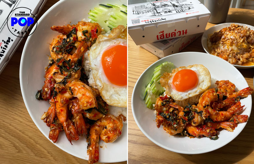 ทางทีมงานเล่าว่าจะคัดไซส์กุ้งทะเล ไซส์ 20-22 ตัวต่อกิโลกรัมเท่านั้น และสั่งวันต่อวันเพื่อความสดของวัตถุดิบ จานกุ้งอีกจานเราเลือก ข้าวกะเพรากุ้งโบราณไข่เป็ดดาว (260 บาท) จานนี้ผัดรสจัด และให้กุ้งแน่นกล่องมาก