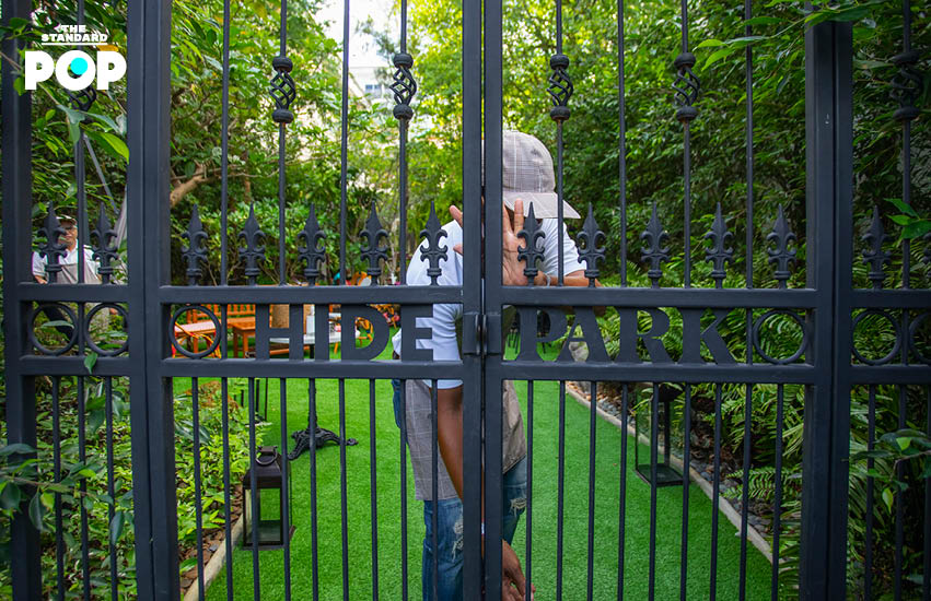 เมื่อช่วงเดือนกรกฎาคมที่กรุงเทพฯ ยังอยู่ในช่วงคลายล็อกดาวน์ระยะแรกๆ ที่ร้านอาหารเริ่มกลับมาเปิดให้บริการภายใต้ข้อจำกัดท่ามกลางวิกฤตโควิด-19 เราได้มีโอกาสเห็นภาพของตะกร้าปิกนิกที่ภายในเสิร์ฟเบอร์เกอร์ชิ้นโตตั้งอยู่ท่ามกลางสวนสีเขียวและภาพของน้ำตกเป็นฉากหลัง มองดูชวนให้นึกถึงปิกนิกฤดูร้อนในประเทศอังกฤษ หรือสวนหลังบ้านของใครสักคนที่เจ้าบ้านดูแลสวนเป็นอย่างดีและรักการจัดปาร์ตี้เอาเสียมากๆ ก่อนจะพบกับความจริงว่า ภาพความร่มรื่นที่เห็นตั้งอยู่กลางสาทรซอย 12 นี้เอง หลังประตูรั้วเหล็กบานใหญ่ระบุชื่อว่า Hide Park