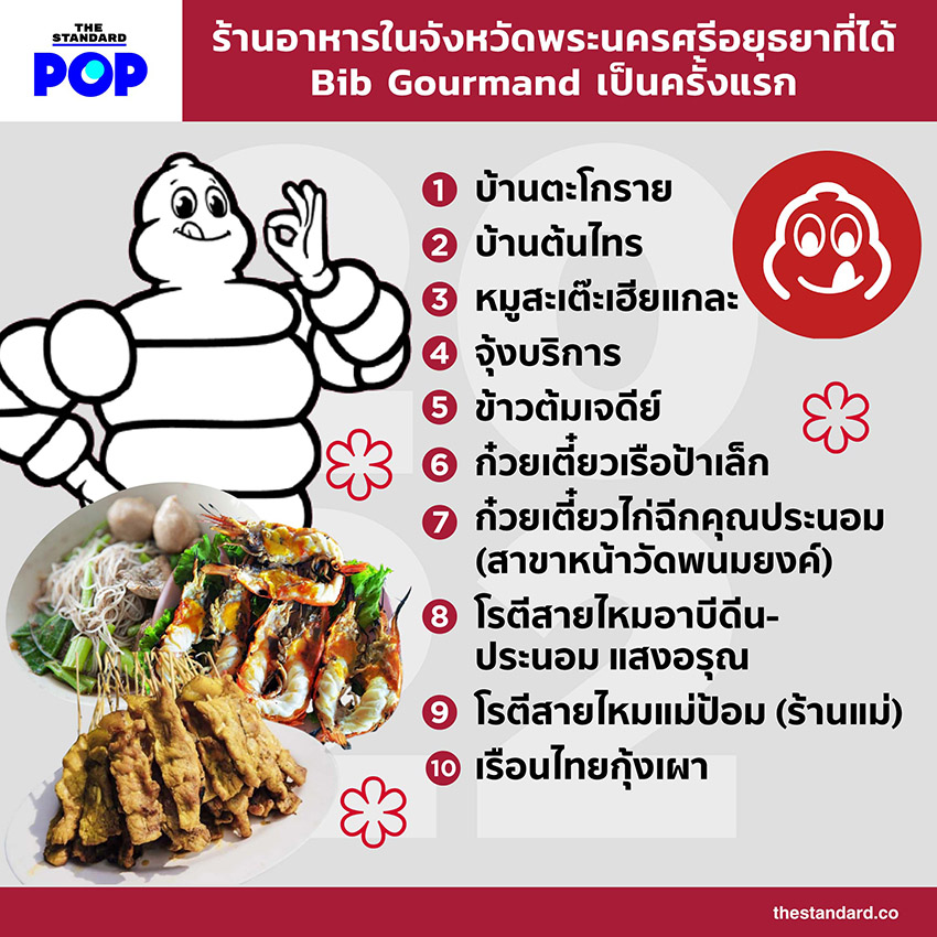 ในฐานะที่ปีนี้เป็นปีแรกที่รางวัลมิชลิน ไกด์ ได้เพิ่มจังหวัดพระนครศรีอยุธยาเข้ามาเป็นครั้งแรก ถึงปีนี้อยุธยายังไม่มีร้านใดที่ได้รับดาวมิชลิน แต่เราเชื่อว่าจังหวัดนี้เต็มไปด้วยร้านอร่อยของโปรดของใครหลายคนแน่นอน ระหว่างนี้ตามรอย Bib Gourmand กันไปก่อน ดูรายชื่อรางวัล Bib Gourmand ทั้งหมดได้ที่ https://thestandard.co/michelin-guide-thailand-bib-gourmand-2022/