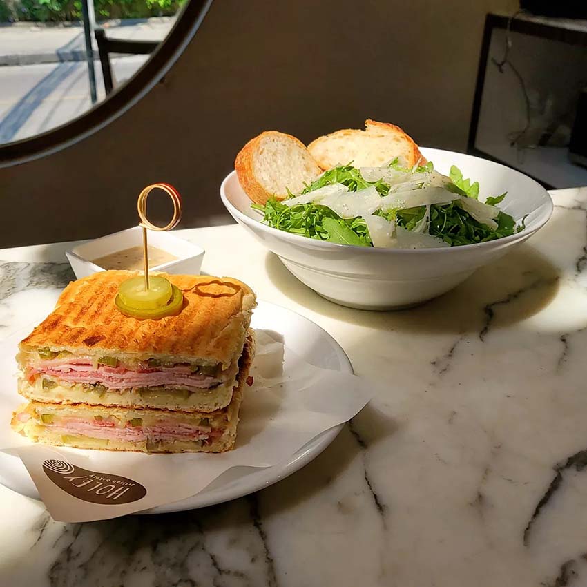 แน่นอนว่าขนมปังอบสดใหม่ยังคงจัดเต็มหลายประเภท ส่วนเมนูอิ่มท้องสไตล์บรันช์ก็มีให้บริการเช่นเคย หากยังไม่แน่ใจว่าจะเริ่มต้นที่เมนูไหนดี เราแนะนำ Marcolino (400 บาท) ขนมปังบาแกตต์หั่นครึ่ง ยัดผักรวม มะเขือเทศแดดเดียว โพรโวโลนชีส สเปกแฮม คอปปาแฮม แฮมรมควัน พริกดอง มายองเนส น้ำมันมะกอก และเอจบัลซามิก เครื่องแน่นแบบนี้ แค่ชิ้นเดียวก็อิ่มยาวตลอดวัน