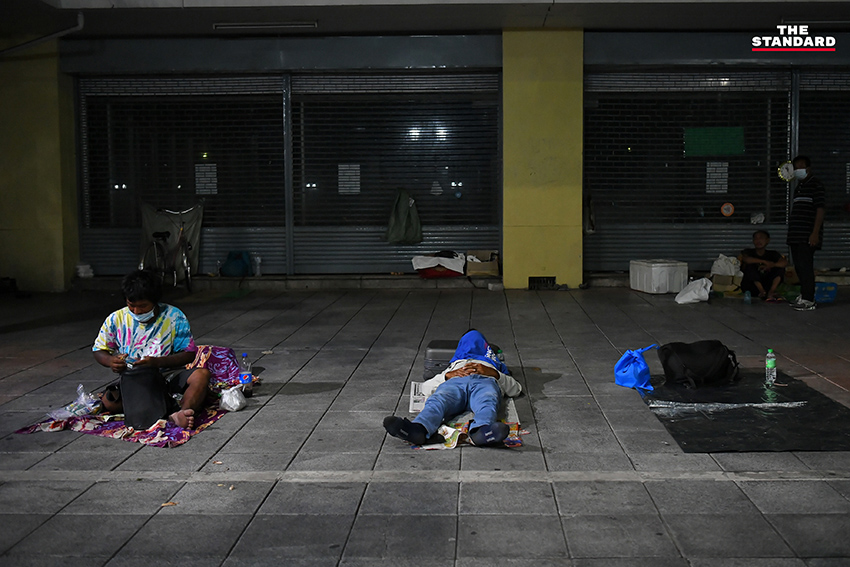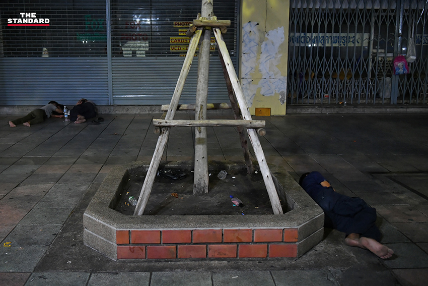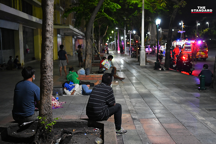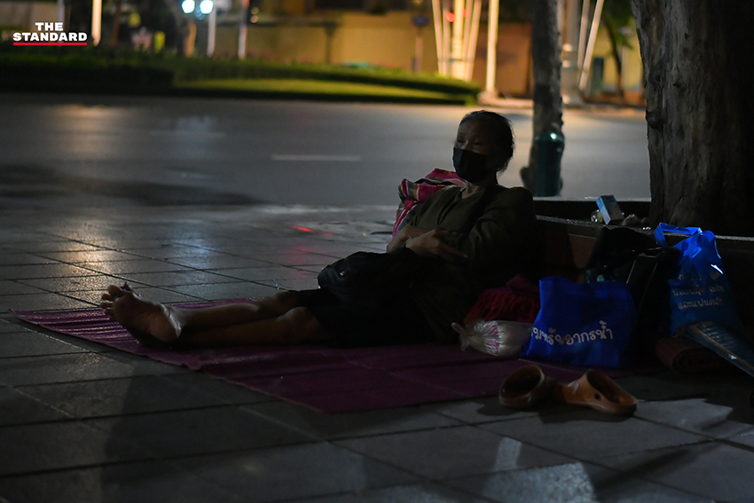 THE STANDARD ลงพื้นที่ถนนราชดำเนิน หวังบันทึกเหตุการณ์ร่างผู้เสียชีวิตที่ยังไร้ความเหลียวแล แต่เราพบภาพที่หดหู่ไม่แพ้กันนั่นคือ ‘กลุ่มคนไร้บ้าน’ ที่จับจองพื้นที่บริเวณถนนราชดำเนิน สายตาพวกเขาว่างเปล่าไร้ความหวัง และสิ่งที่รู้สึกได้คือจำนวนคนไร้บ้านเยอะขึ้นกว่าเดิมจนสังเกตได้ เราถามคนไร้บ้านท่านหนึ่งบอกว่า เพิ่งมานอนข้างถนนไม่กี่เดือนก่อนหลังการระบาดโควิดรอบสาม เพราะไม่มีค่าเช่าบ้านเลยต้องมานอนข้างถนน รอรับอาหารแจกจากผู้ใจบุญ และตอนนี้เริ่มรู้สึกไม่สบาย โดยจุดที่พวกเขาอาศัยนอนก็อยู่ไม่ห่างจากจุดที่มีคนตาย