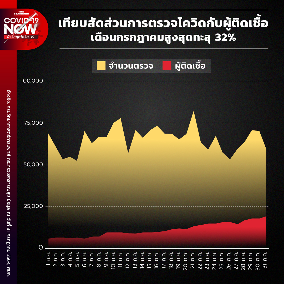 - ขณะที่วันที่ 31 กรกฎาคมที่ผ่านมา ไทยตรวจโควิดแบบ RT-PCR ไป 59,041 คน พบผู้ติดเชื้อ 18,912 คน หรือคิดเป็น 32% ของการตรวจ ซึ่งถือว่าอยู่ในขั้นที่วิกฤตมาก เพราะองค์การอนามัยโลกเคยแนะนำว่าอัตราการตรวจพบเชื้อไม่ควรเกิน 5% ถึงจะถือว่าควบคุมการระบาดได้ (https://thestandard.co/compare-the-proportion-of-covid-test-with-infected-people-july2021/)
