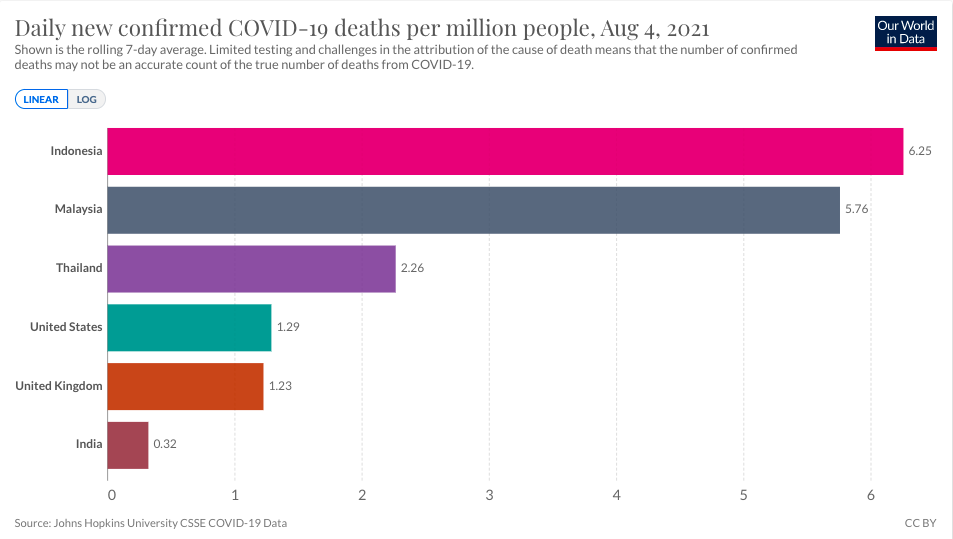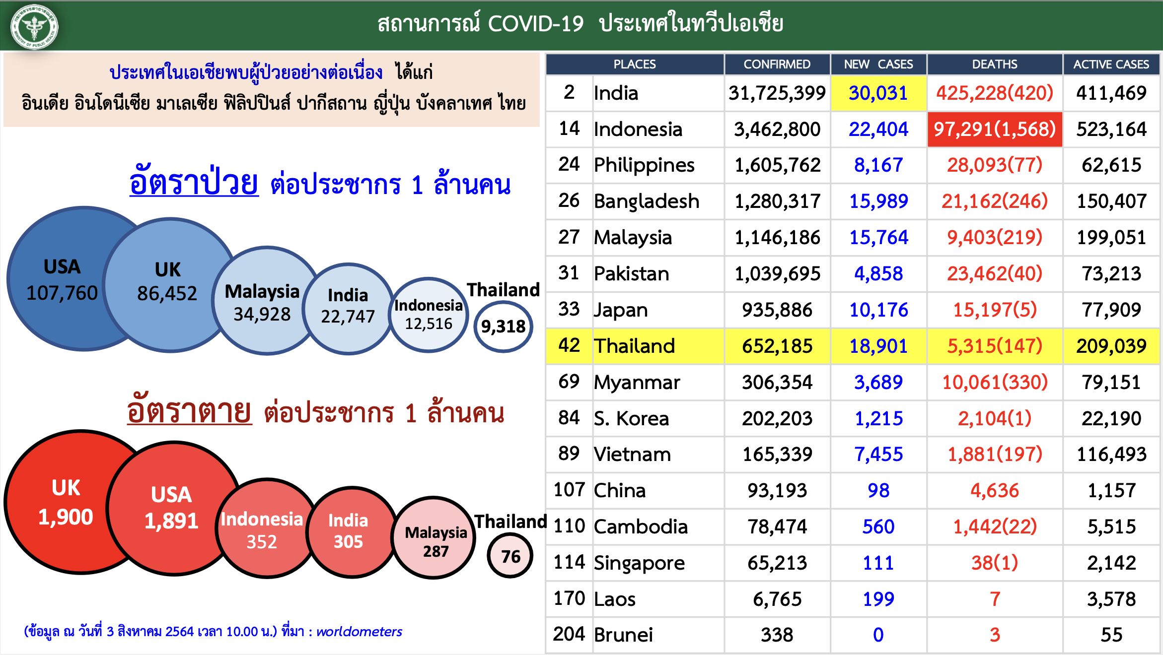 - เช่นเดียวกับอัตราป่วยและอัตราตายต่อประชากร 1 ล้านคน ที่ในภาพรวมประเทศไทยมีตัวเลขน้อยกว่าประเทศที่ถูกหยิบยกมาเทียบเคียงอย่างสหรัฐอเมริกา สหราชอาณาจักร มาเลเซีย อินเดีย และอินโดนีเซีย อย่างเห็นได้ชัด